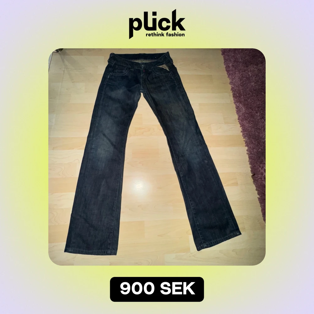 Säljer ett par snygga mörkblå jeans från Replay. Dem är lågmidjade och utsvängda