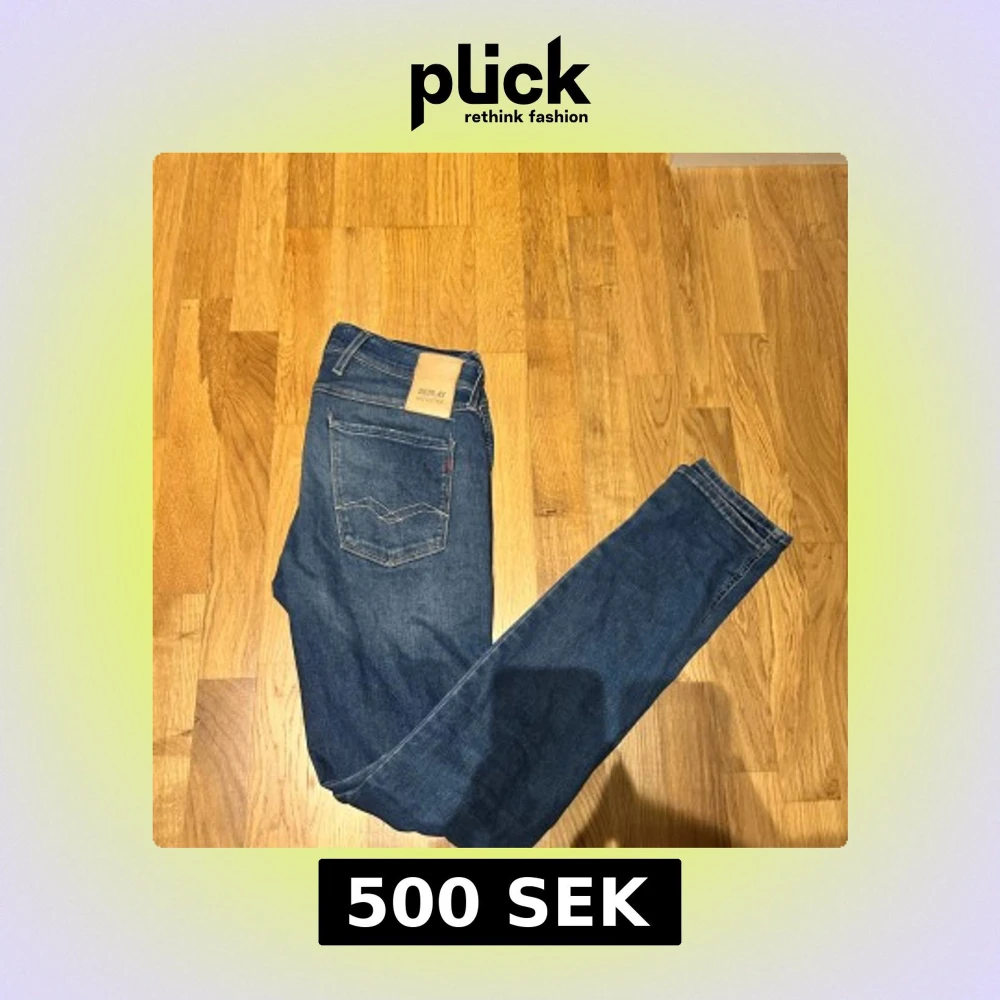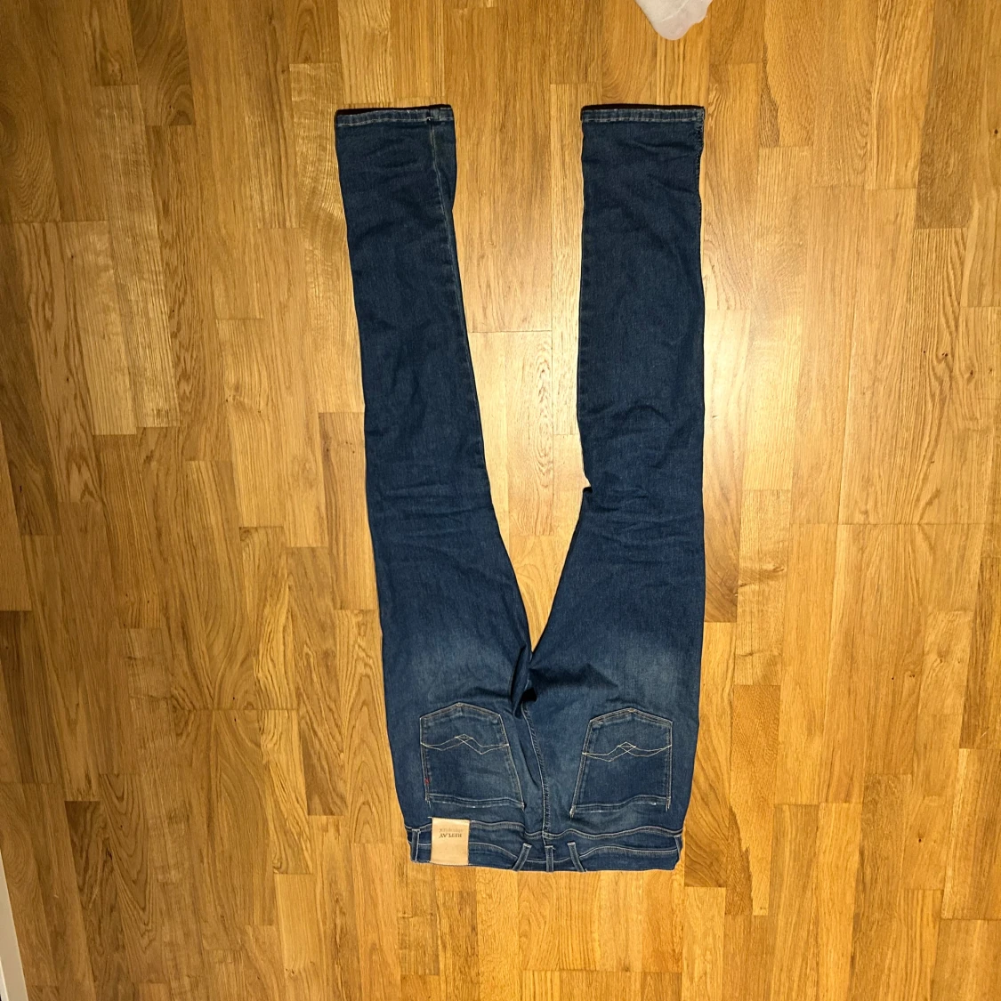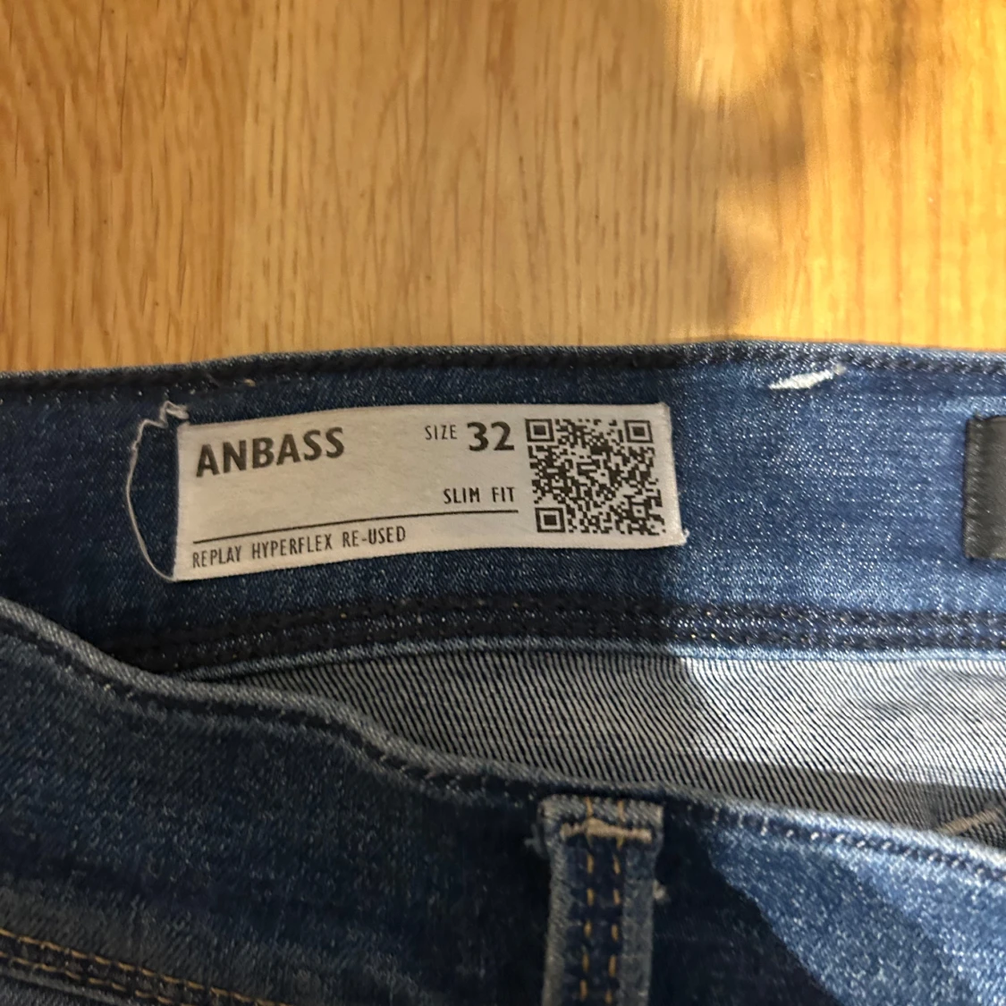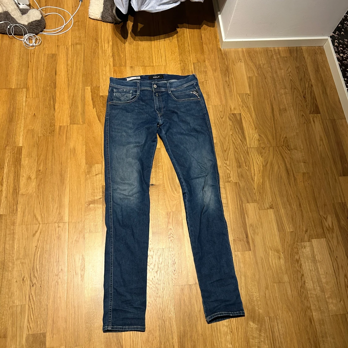 Säljer ett par blå Replay Anbass Hyperflex jeans i slim fit. Storlek 32/34 ny priss ligger runt 1500kr. Jeansen har en liten defekt vid gylfen men inget man tänker på