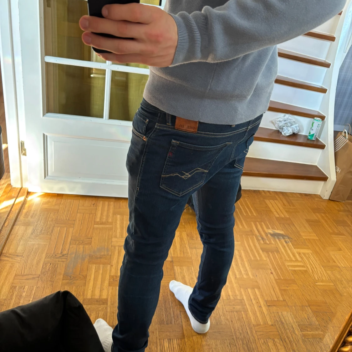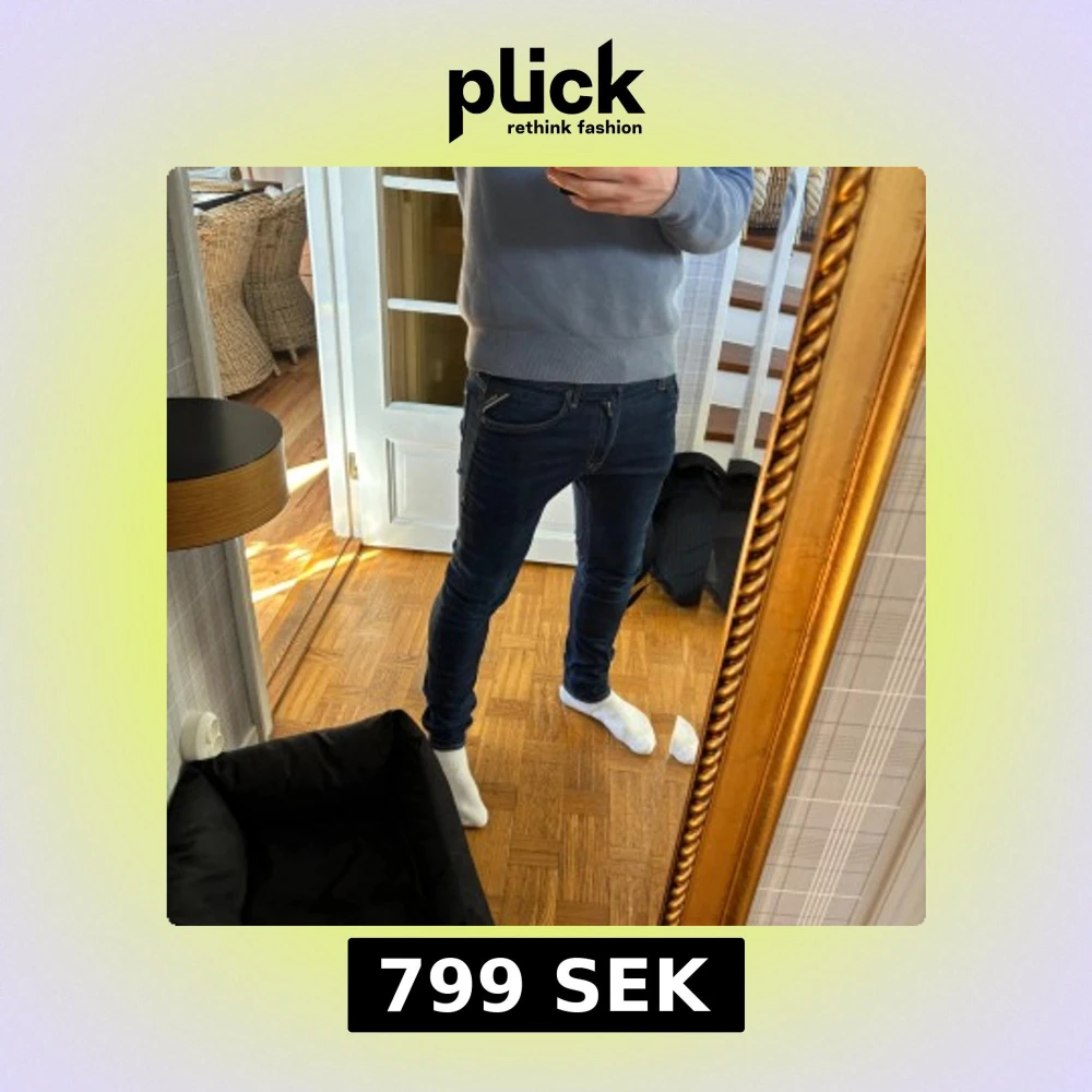 Säljer ett par mörkblå slim fit jeans från Replay med klassiska femficksdetaljer och snygga kontrastsömmar på bakfickorna. Jeansen har låg midja och är tillverkade i stretchig denim för en tight passform. Perfekta för dig som gillar en modern och stilren look.