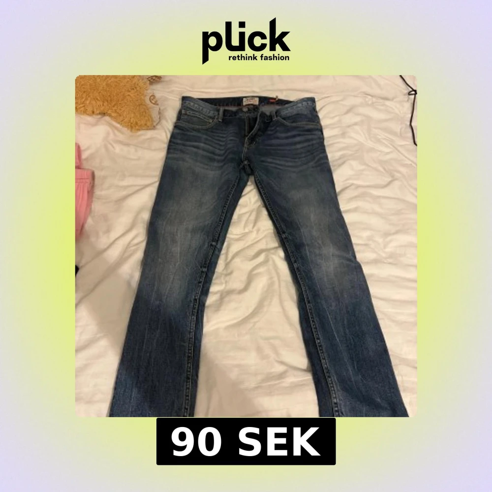 Säljer ett par blå Replay Anbass jeans med snyggt slitna detaljer och klassisk femficksdesign. Jeansen har en smal passform och är tillverkade i mjukt denimtyg som sitter skönt hela dagen. Perfekta för dig som gillar en modern och stilren look.