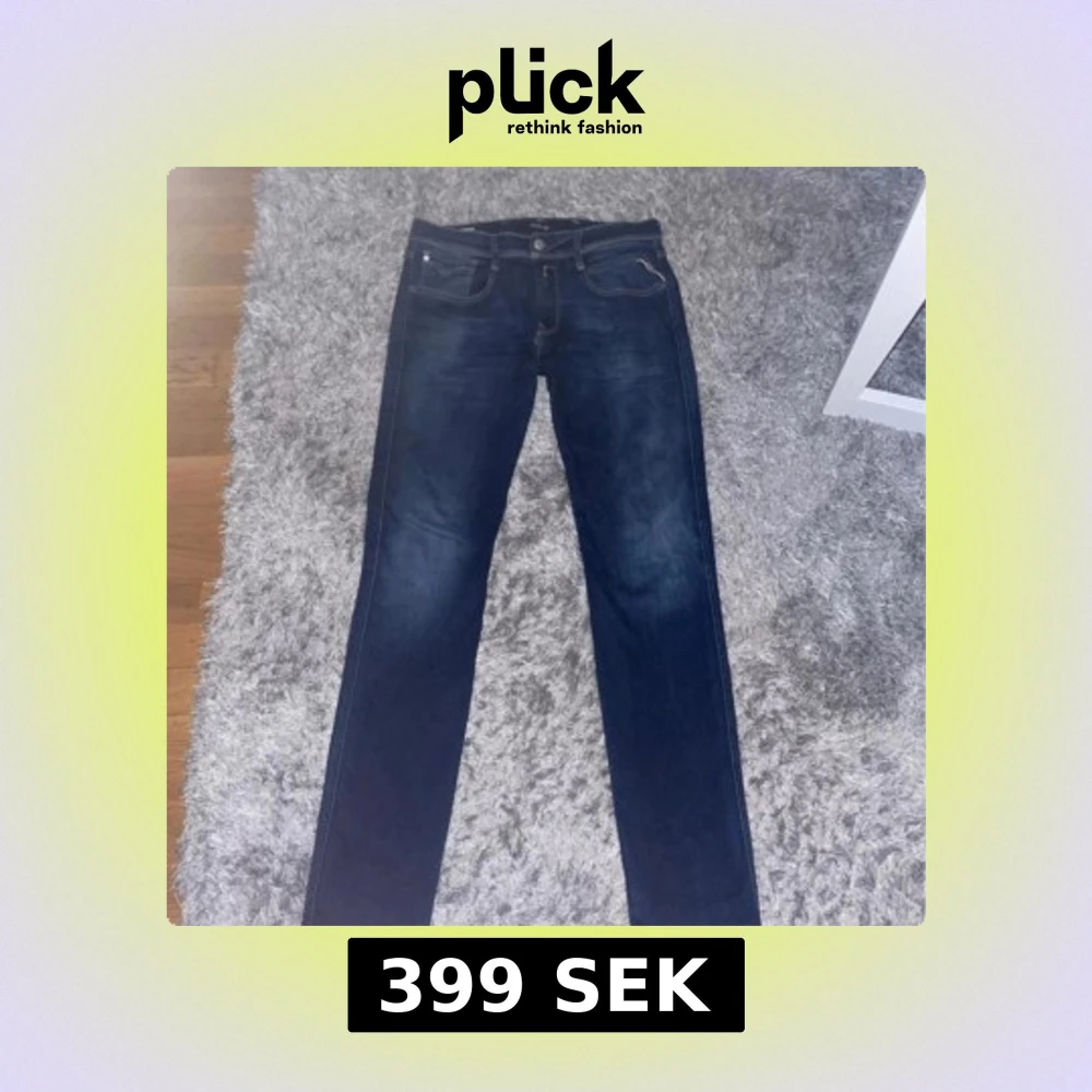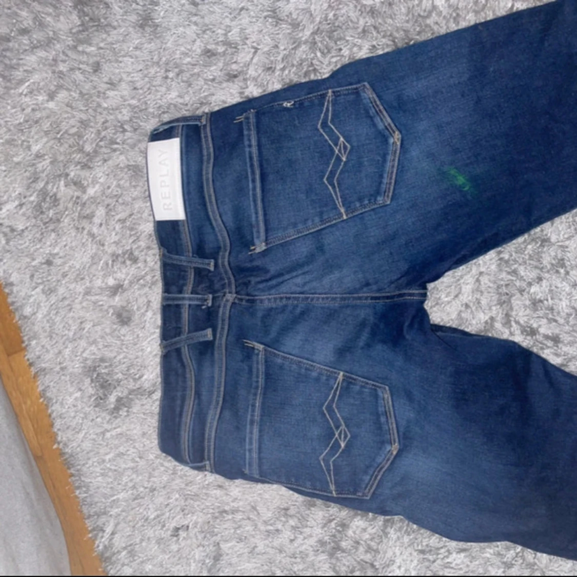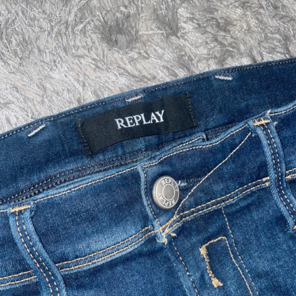 Säljer ett par snygga blå jeans från Replay med klassisk femficksdesign och ljusa kontrastsömmar. Jeansen har raka ben och normal passform, med Replay-logga på bakfickan och knapp. Perfekta till din vardagsstil!