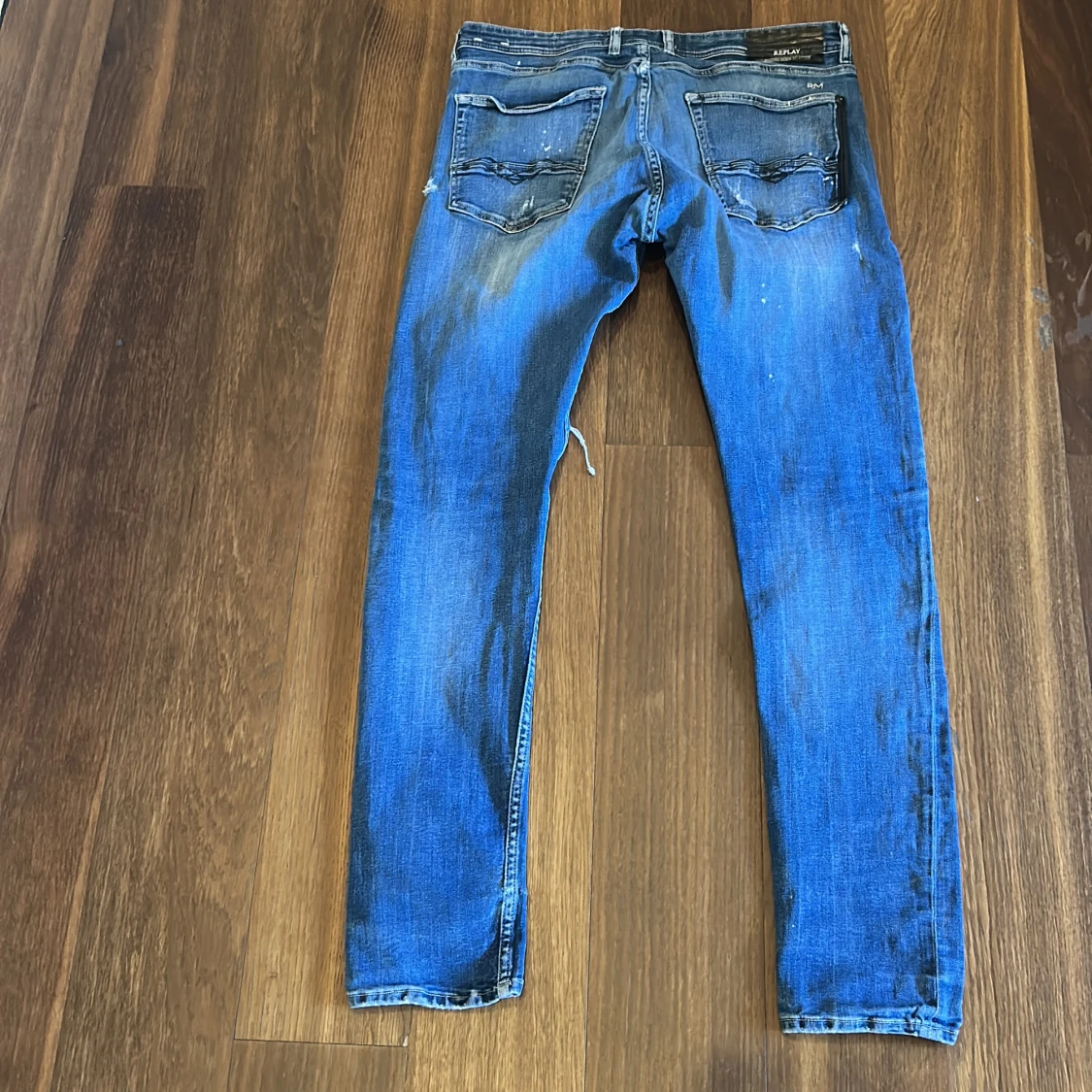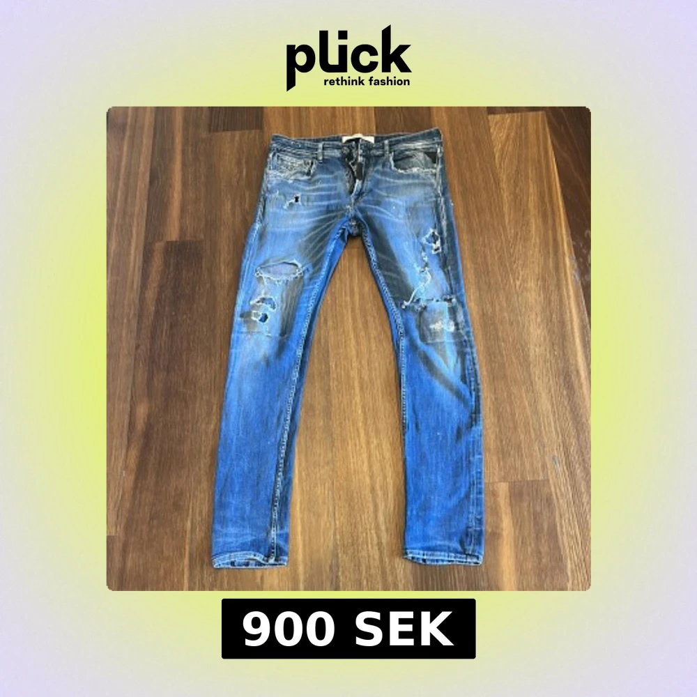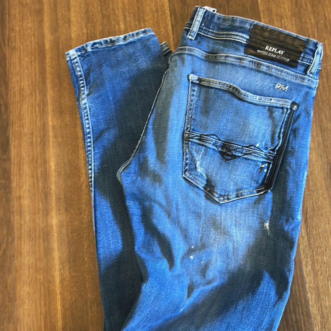 Säljer ett par blå jeans från Replay med coola slitningar och trasiga detaljer på benen. Jeansen har klassisk femficksdesign, smal passform och är tillverkade i jeansmaterial. Perfekta för dig som gillar en avslappnad och trendig look.