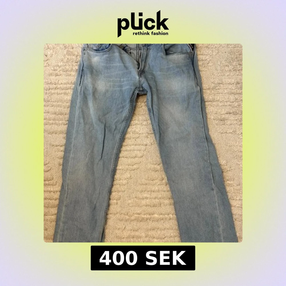 Säljer ett par ljusblå jeans från Replay med klassisk femficksdesign och snygga detaljer som Replay-logga på bakfickan och läderpatch i midjan. Jeansen har normal passform och raka ben, perfekta till vardags. Size 32