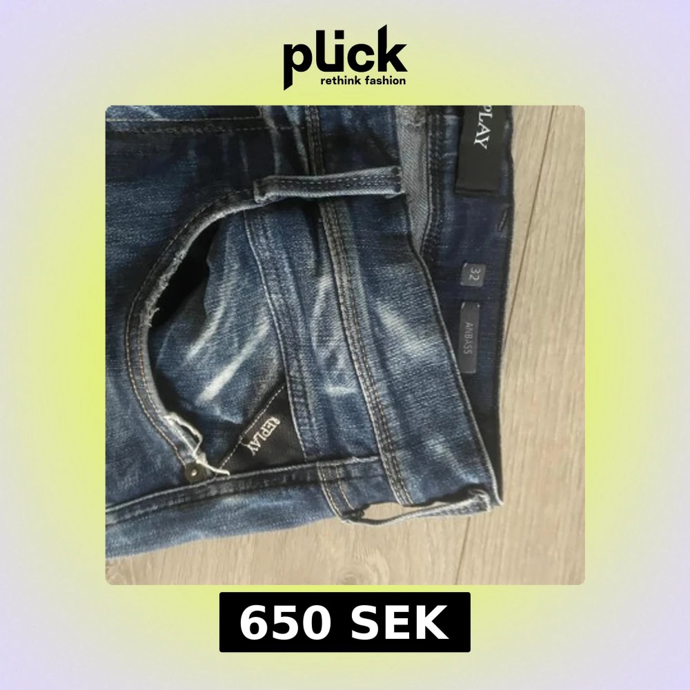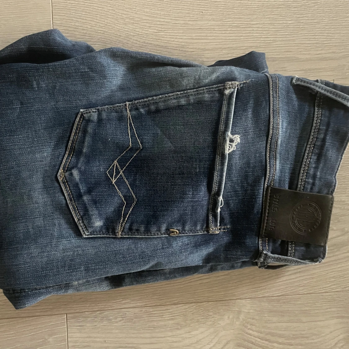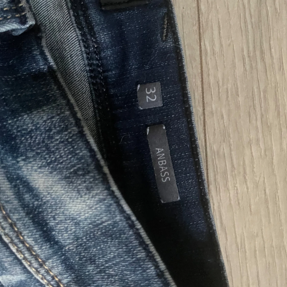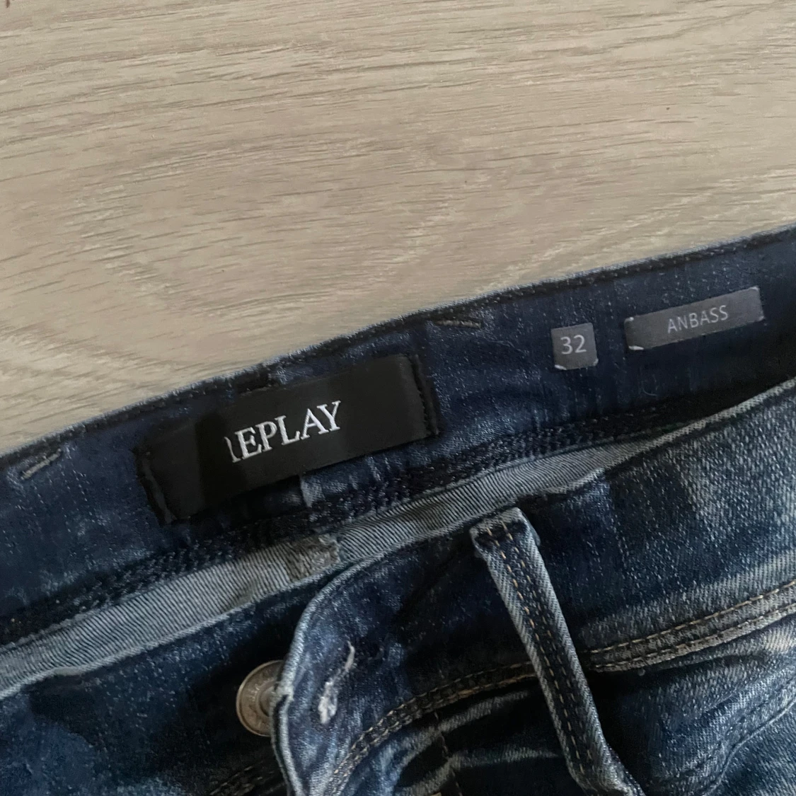 Säljer ett par Replay Anbass jeans i blå tvätt med snygga slitningar och klassiska detaljer. Jeansen har fem fickor, tydliga kontrastsömmar och en cool bakficka med broderad design. Perfekt passform och stilren look.
