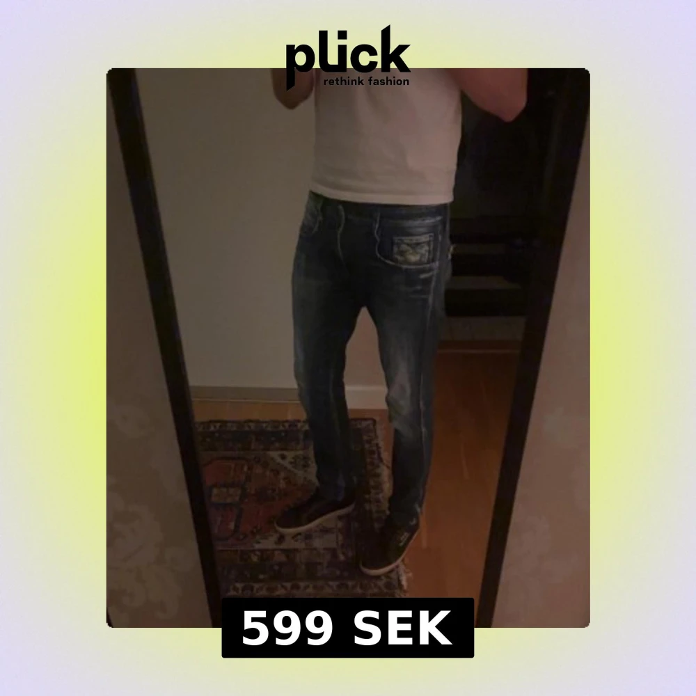 Säljer ett par Replay Anbass jeans i blå tvätt med snygga slitningar och detaljer. Storlek 32/32 har en defekt (sista bilden), märks ej vid användning och kan lösas på något sätt isåfall. Men annars i bra skick, hör av dig vid funderingar eller lägg bud!