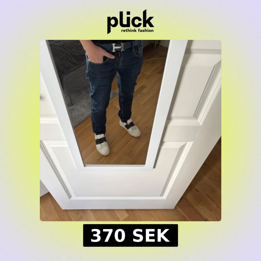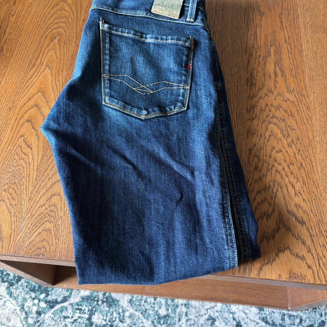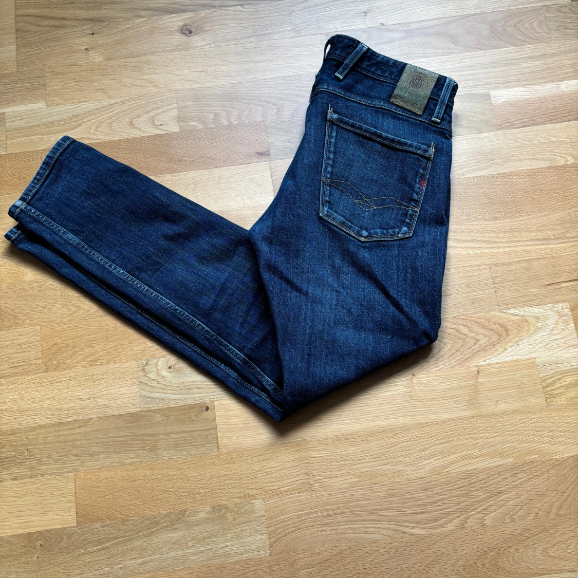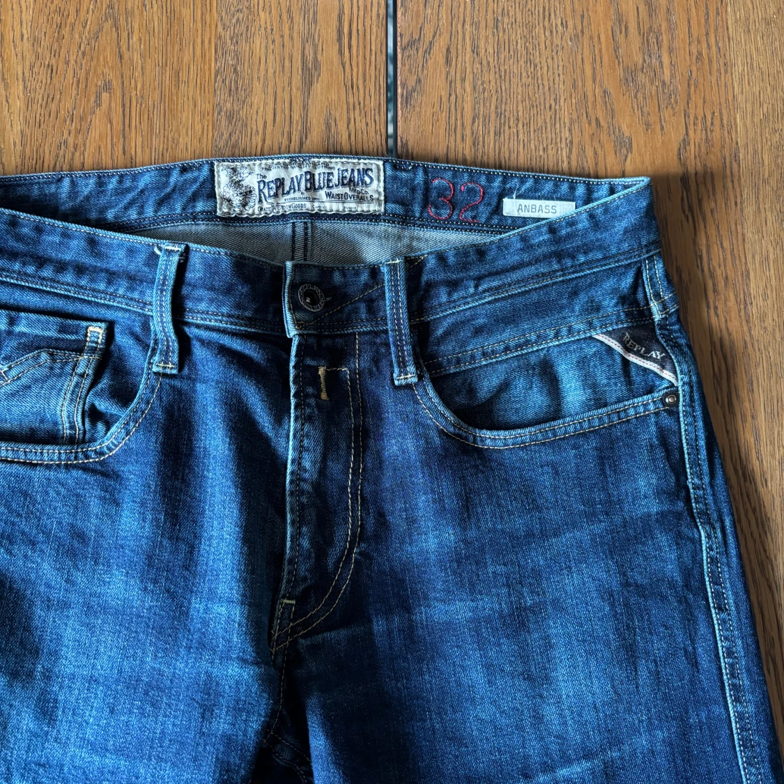 Säljer ett par snygga Replay Anbass jeans i mörkblå tvätt. Klassisk femficksmodell med raka ben och normal passform. Jeansen har diskreta slitningar och tydliga kontrastsömmar. Perfekta för dig som gillar stilrena och bekväma jeans.skriv om du har funderingar