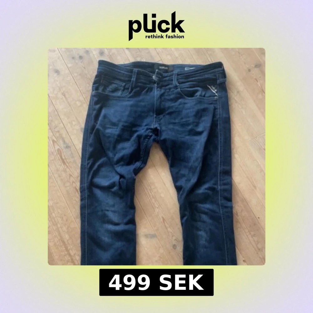 Säljer ett par mörkblå jeans från Replay med klassisk femficksdesign och dragkedja. Jeansen har en snygg tvätt och raka ben, perfekta för en avslappnad och stilren look.