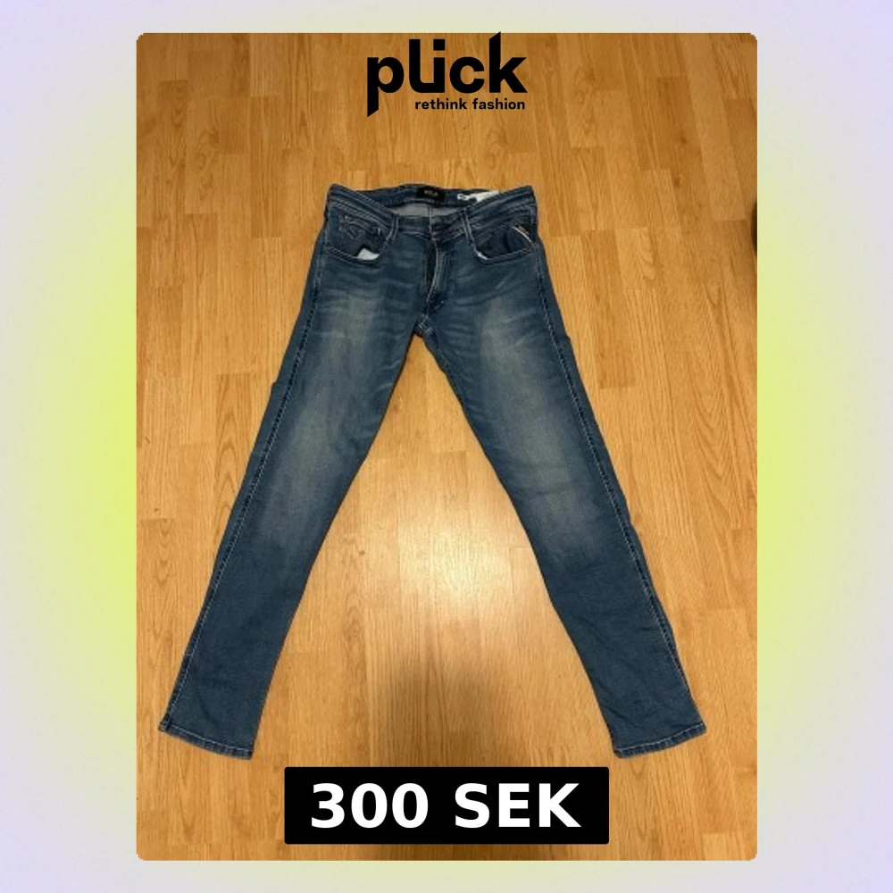 Säljer ett par snygga blå jeans från Replay i modellen slim fit. Jeansen har klassisk femficksdesign, ljusa slitningar och raka ben. Materialet är stretchigt denim med inslag av elastan för extra komfort. Perfekt för dig som gillar stilrena och moderna jeans.
