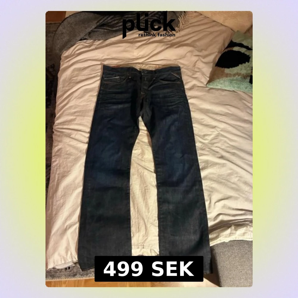 Säljer ett par Replay Waitom jeans i mörkblå denim med klassisk femficksdesign och snygga kontrastsömmar. Modellen har rak passform och tydlig Replay-logga på fickan samt patch bak.