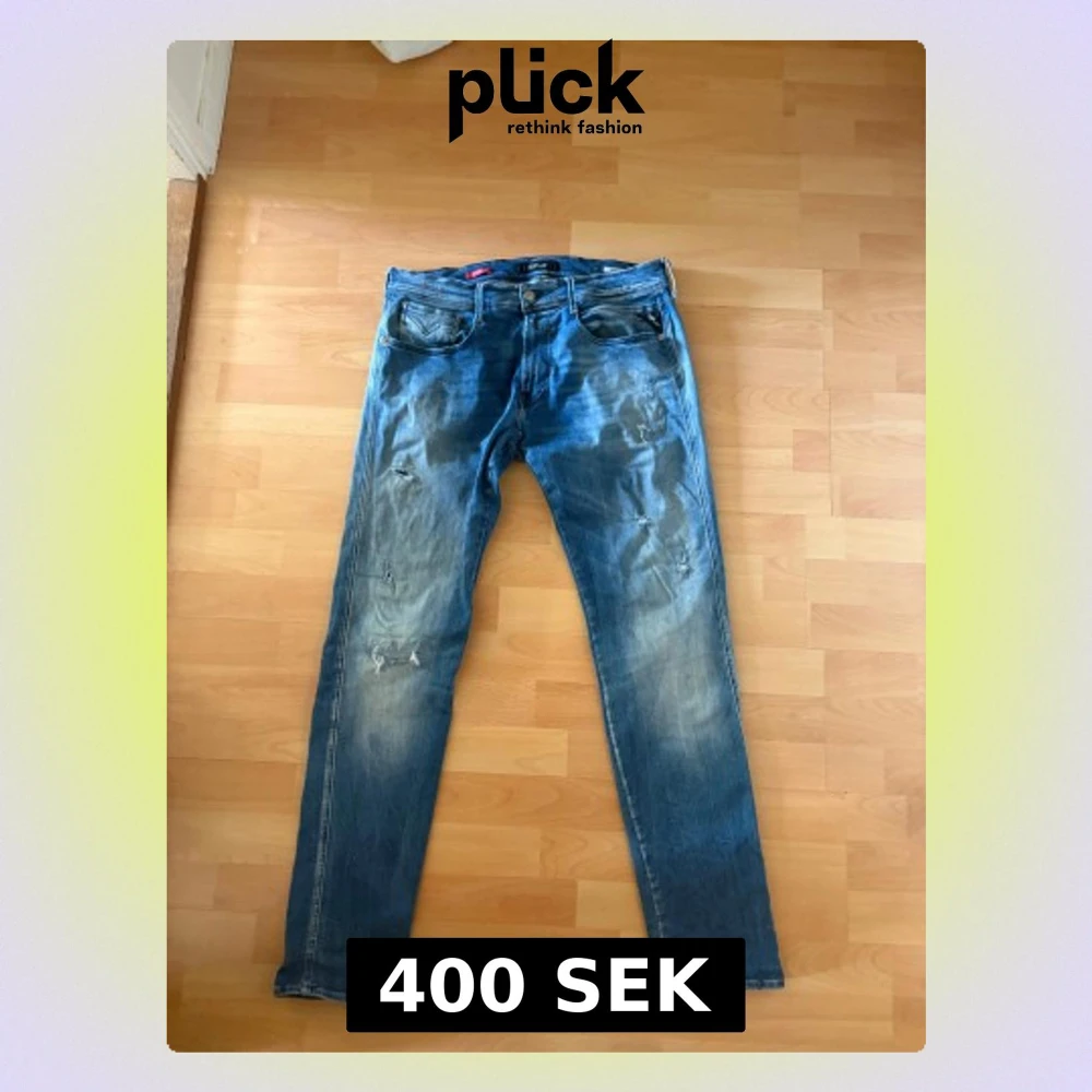 Säljer ett par Replay Anbass jeans i blå tvätt med slitningar och hål på benen för en riktigt avslappnad och trendig look. Klassisk femficksmodell med skinny passform och snygga detaljer. Perfekta för dig som gillar streetstyle och vill ha ett par jeans med attityd.