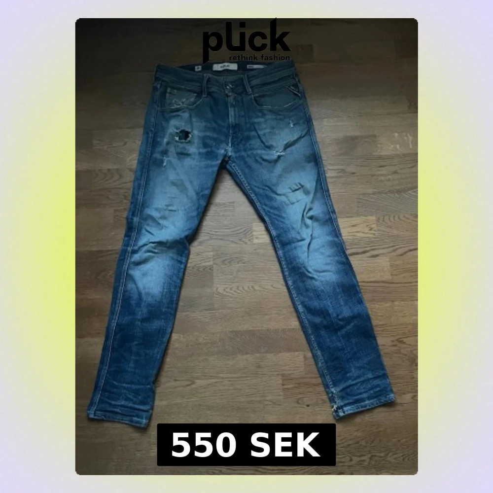 Säljer ett par Replay Anbass slim fit jeans i klassisk blå tvätt. Jeansen har slitningar, hål på låret och snygga detaljer på bakfickorna. De är raka i modellen och har en modern, smal passform. Perfekta för dig som gillar en avslappnad men trendig look. priset är ej hugget i sten, vid övriga frågor och funderingar är det bara att skriva🙌🏻