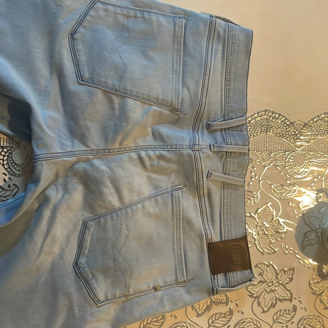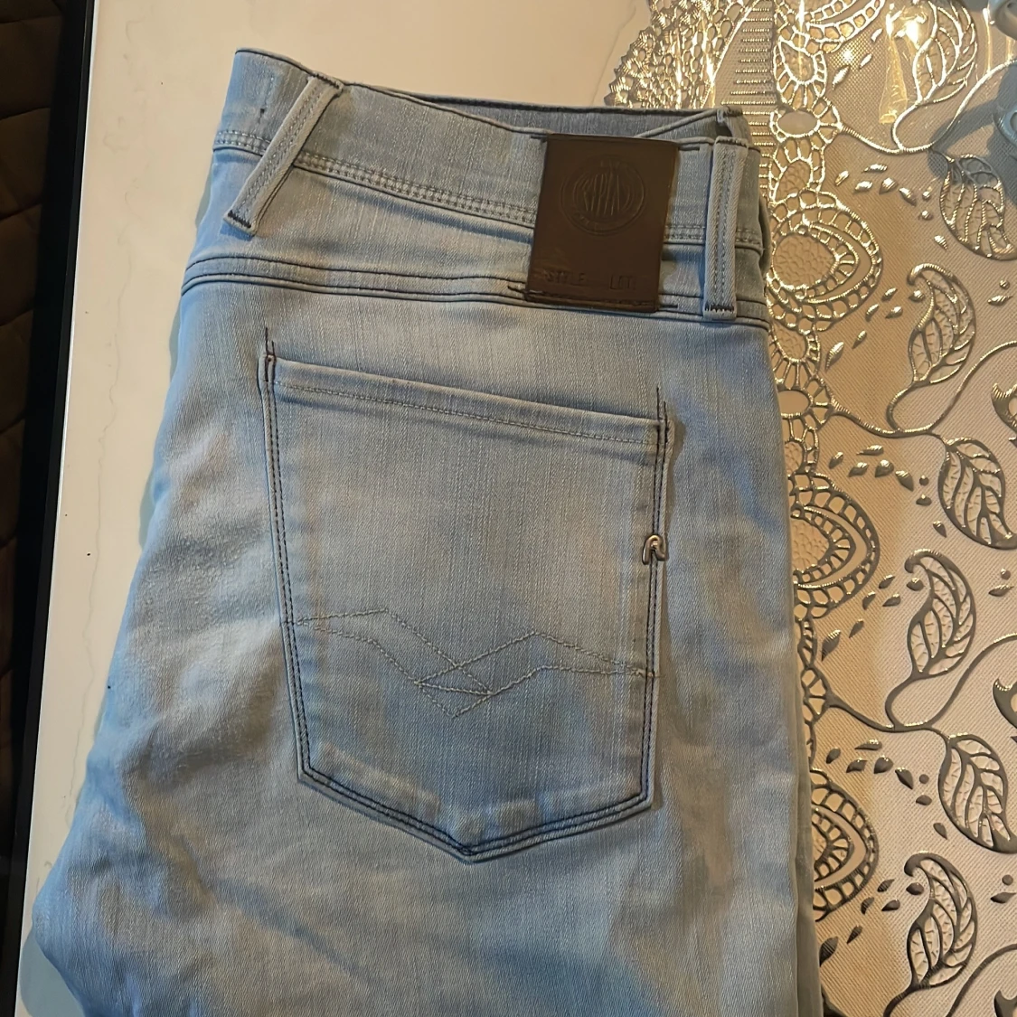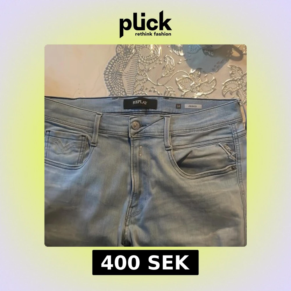 Säljer ett par snygga ljusblå Replay Anbass jeans i klassisk femficksmodell. Jeansen har normal passform, raka ben och är tillverkade i mjukt denimtyg. Perfekta för dig som gillar stilrena och bekväma jeans med diskreta detaljer.