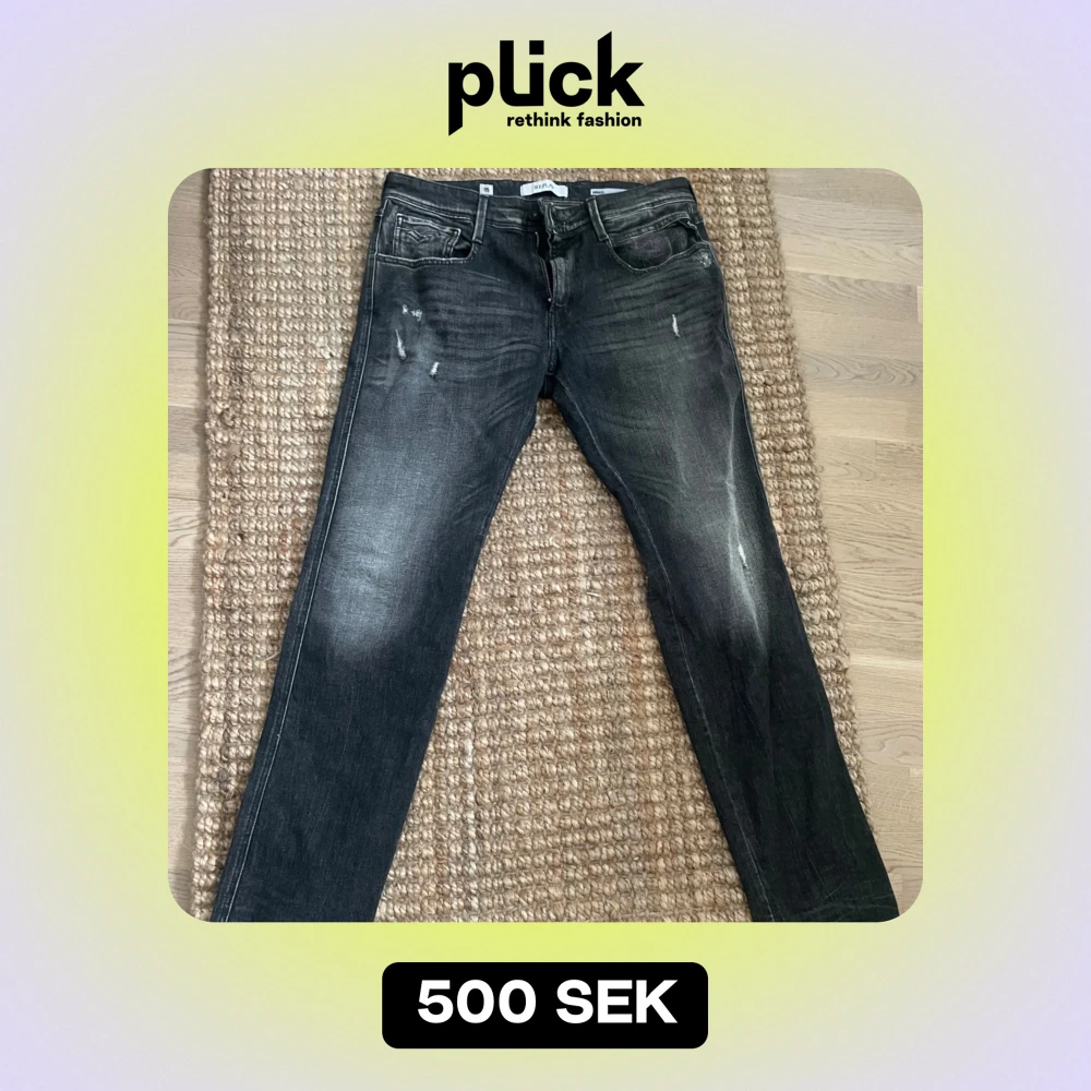 Säljer ett par svarta jeans i bra skick. De har en snygg tvättad look med lite slitningar för en cool stil. Passformen är slimfit och de har en klassisk femficksdesign. Perfekta för både vardag och fest! Storlek är W34 L32.