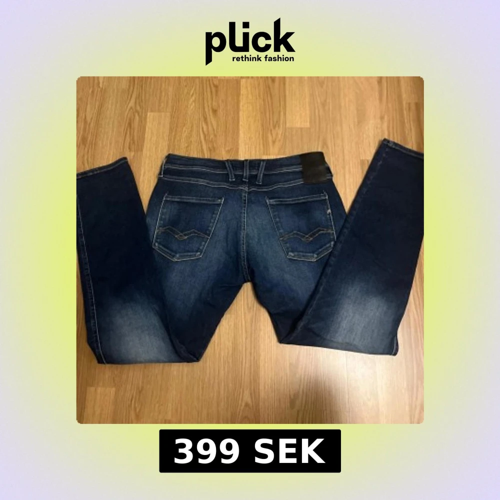 Snygga mörkblå jeans från Replay i modellen Anbass. De har en klassisk femficksdesign med dragkedja och knapp framtill. Perfekta för en stilren look. Väldigt bra skick, inga defekter eller skador!