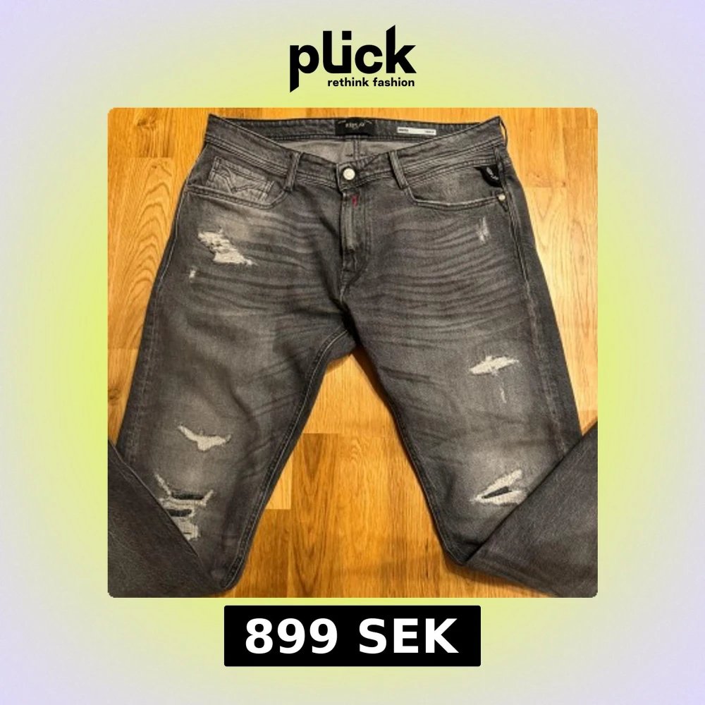 Säljer ett par grå jeans från Replay, modell Rocco Comfort Fit. Jeansen har slitna detaljer och en klassisk femficksdesign. De har raka ben och en snygg tvättad look med ljusare partier och slitningar på låren och knäna. Priset är inte hugget i sten och det är bara att höra av dig vid minsta fundering:).