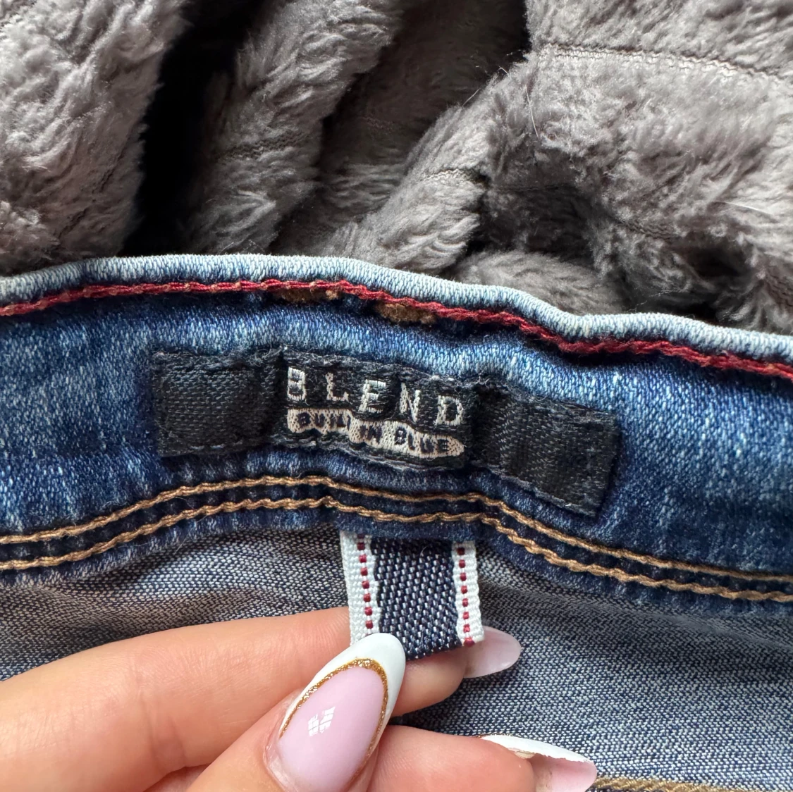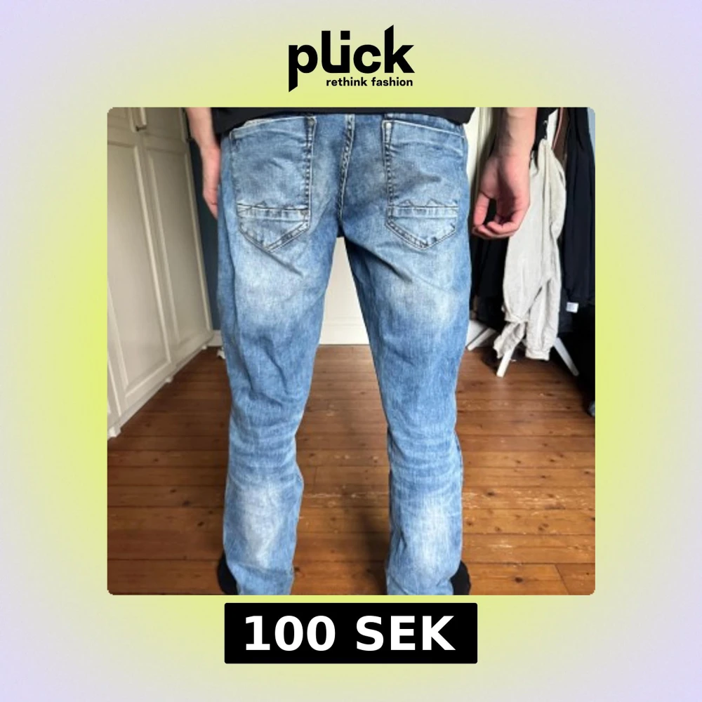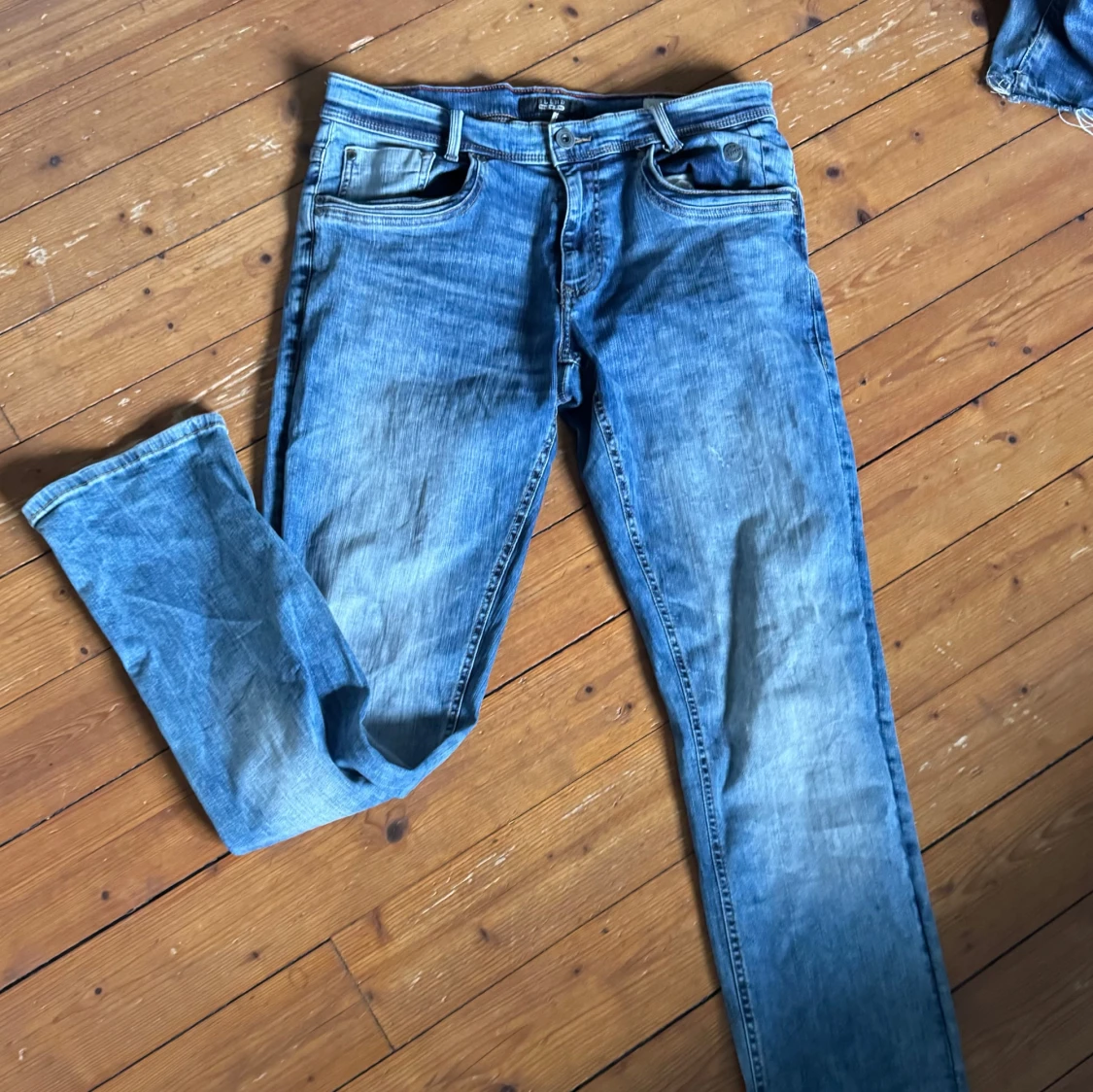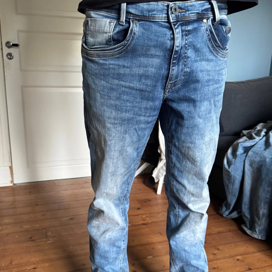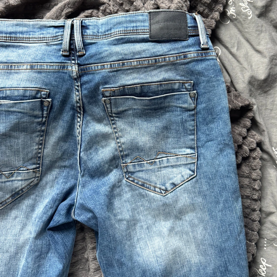 Säljer ett par klassiska blå Replay jeans med snyggt slitna detaljer och raka ben. Jeansen har fem fickor, tydliga sömmar och coola bakfickor med dekorativa sömmar. Hör av dig vid frågor eller funderingar!