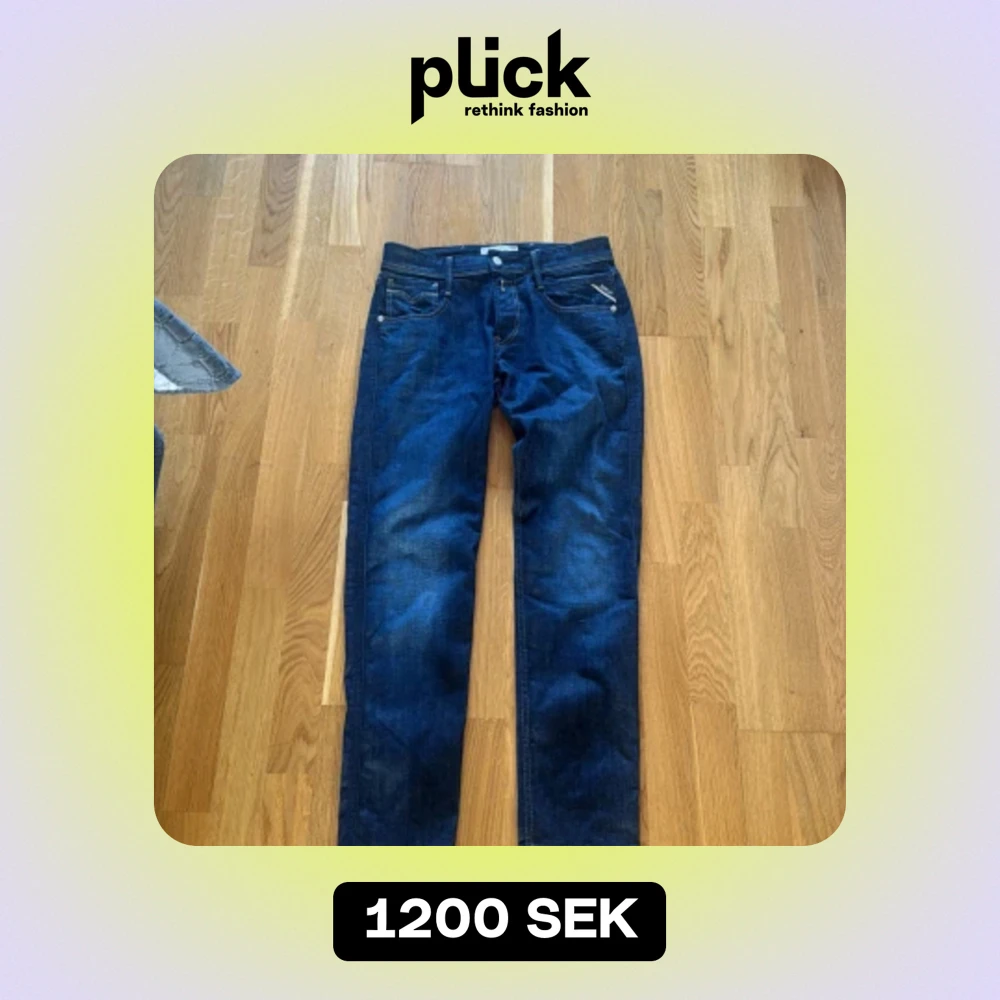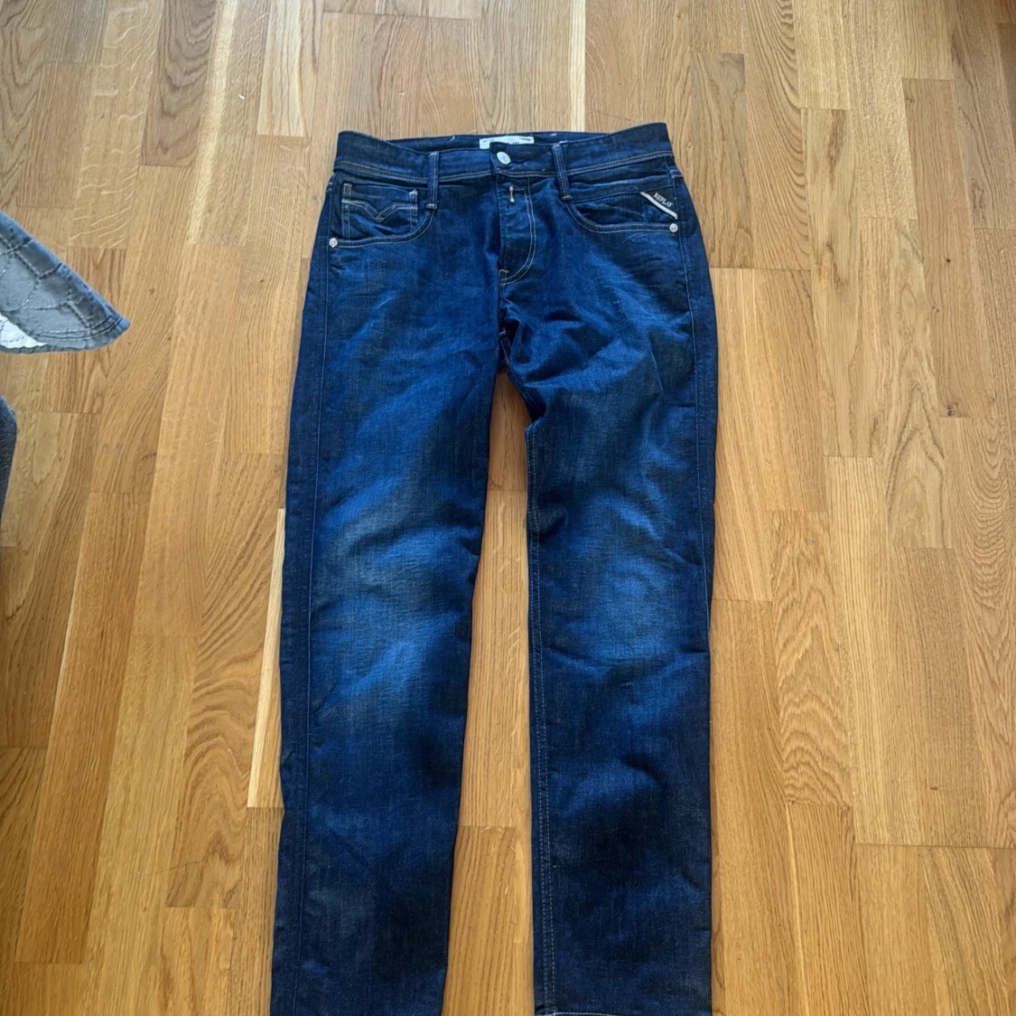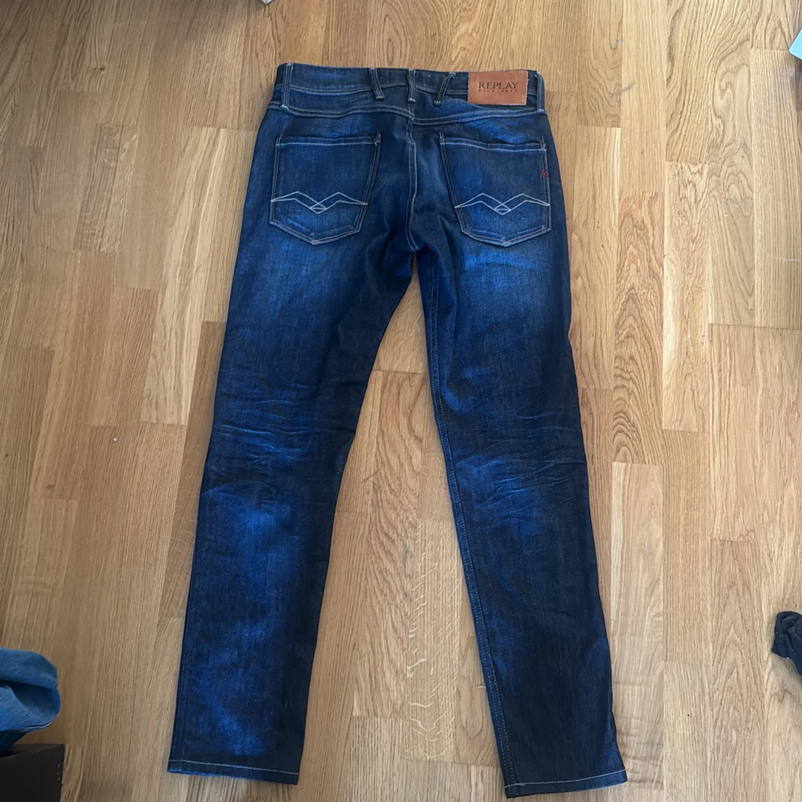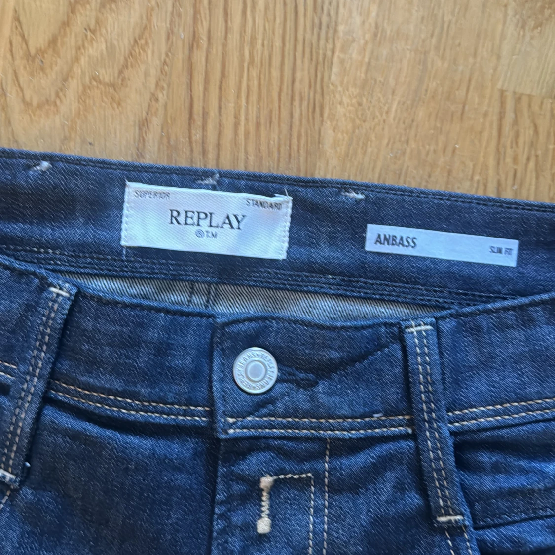 Säljer ett par snygga mörkblå jeans från Replay, modell Anbass. De är i slim fit och har en klassisk femficksdesign med dragkedja och knapp. Jeansen är i bra skick och perfekta för både vardag och fest. Passa på att fynda dessa stiliga jeans! aldrig andvänt dom