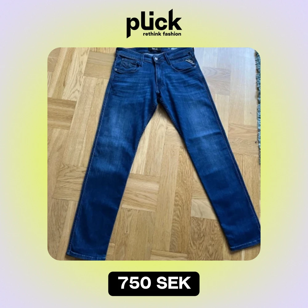 Säljer ett par snygga blå jeans från Replay anbass. Dom är aldrig använda och säljs pågrund av fel storlek. Jeansen är i en mörkblå tvätt med lätt slitna detaljer för en cool look. Slim fit