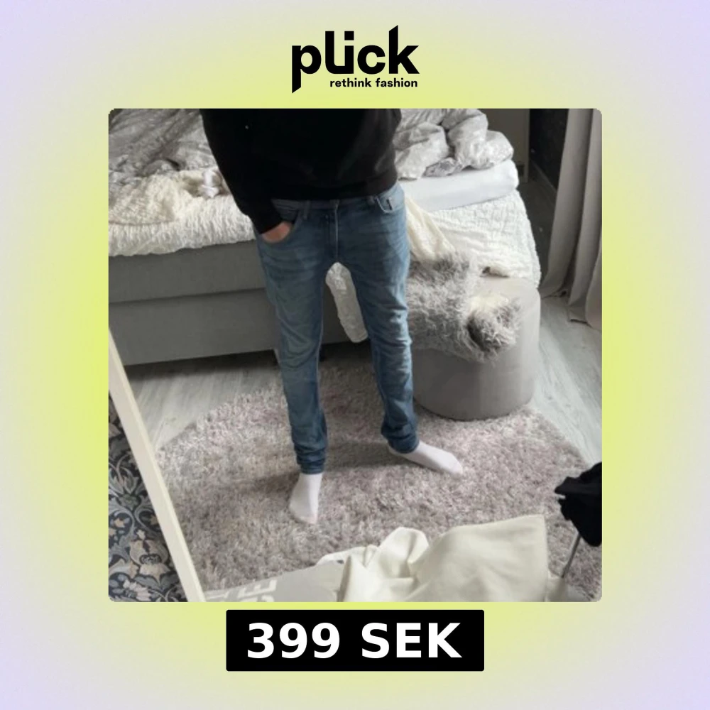 Säljer ett par snygga blå jeans från Replay. De har en bra passform med lite slim fit. De har även snygga slitningar vid höger fickan men även på vänster knät. 9/10
