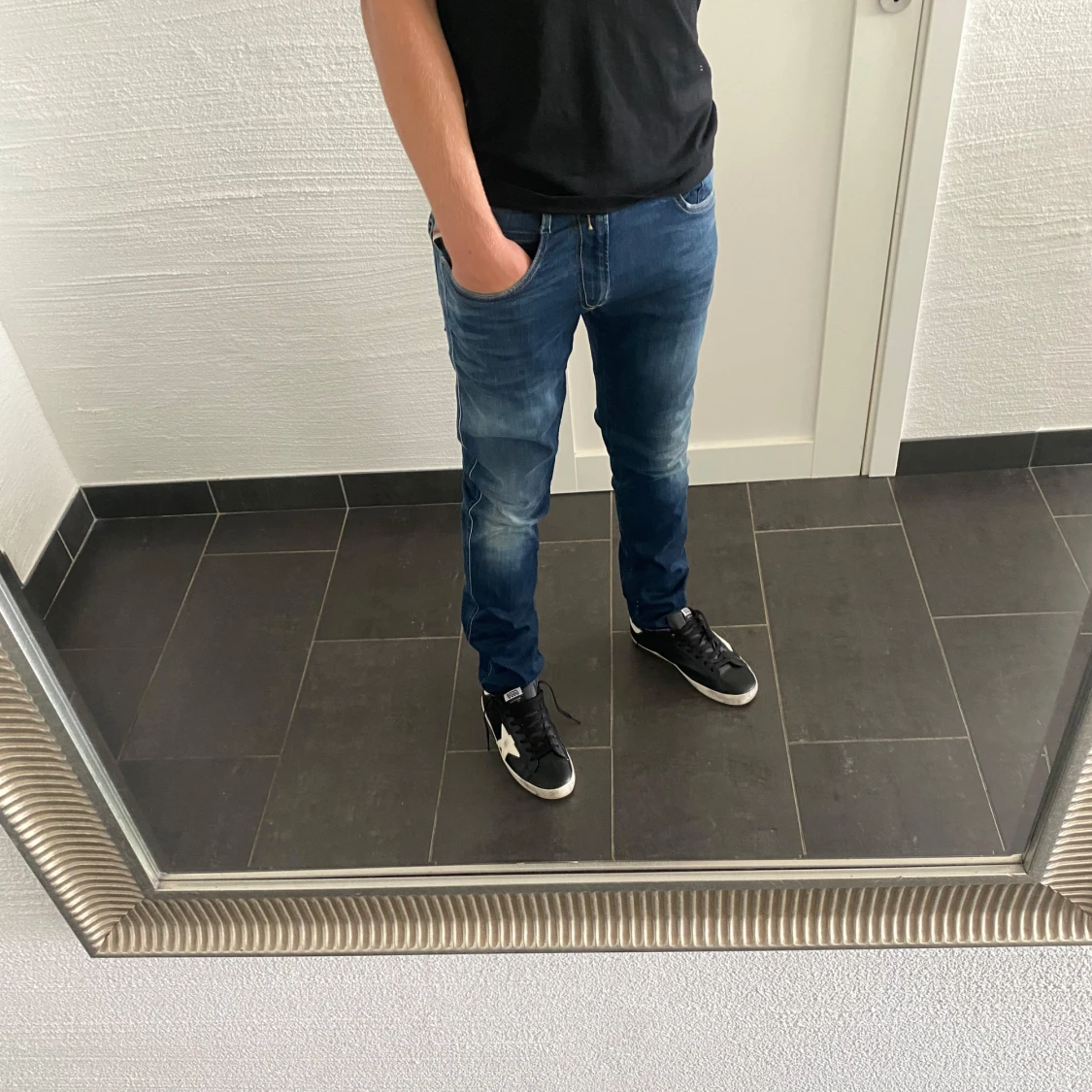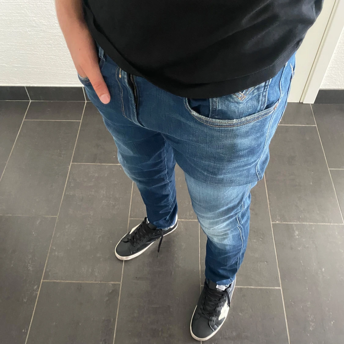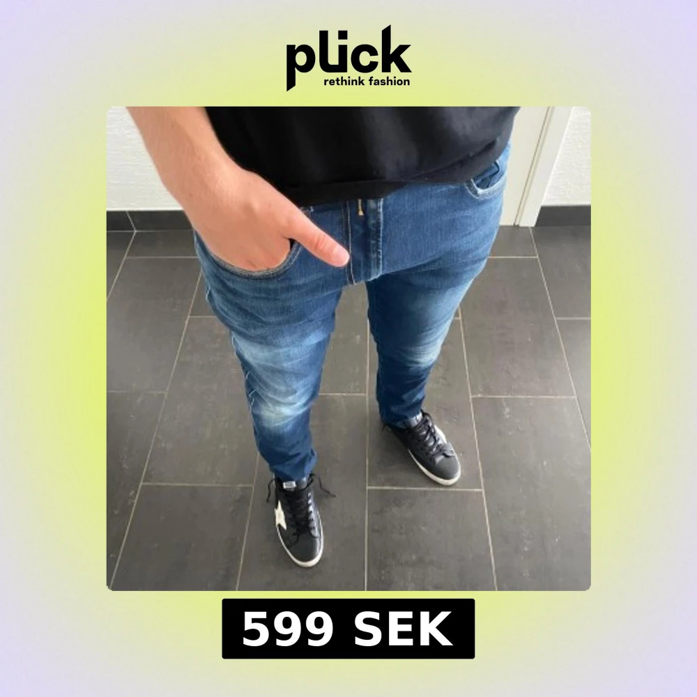 Säljer ett par snygga blå jeans från Replay i modellen slim fit. Jeansen har klassisk femficksdesign, dragkedjegylf och coola slitningar på låren. Perfekta för dig som gillar en modern och stilren look.
