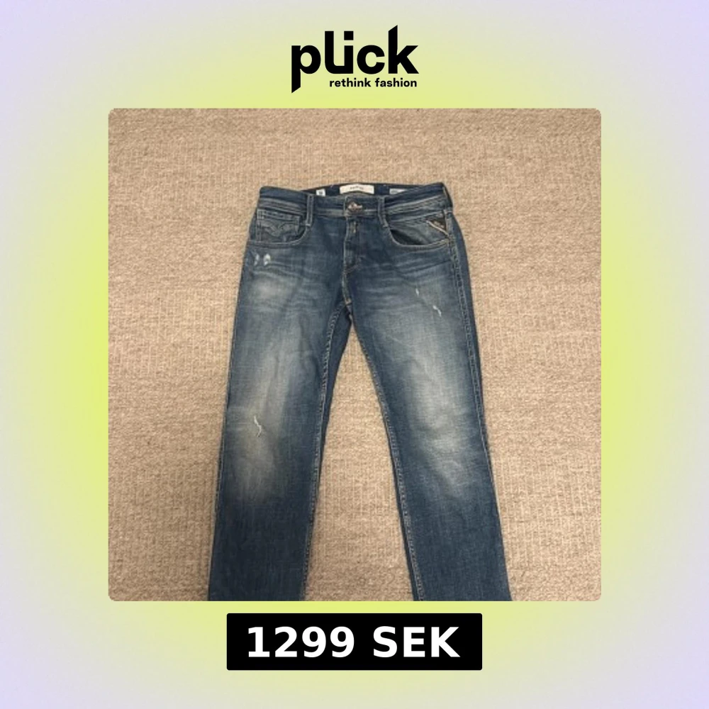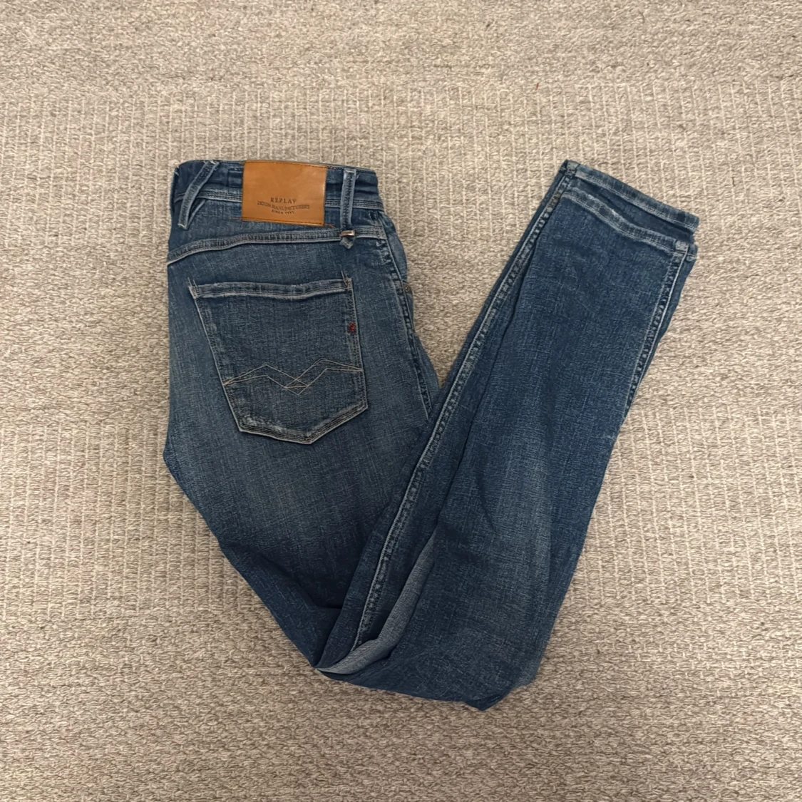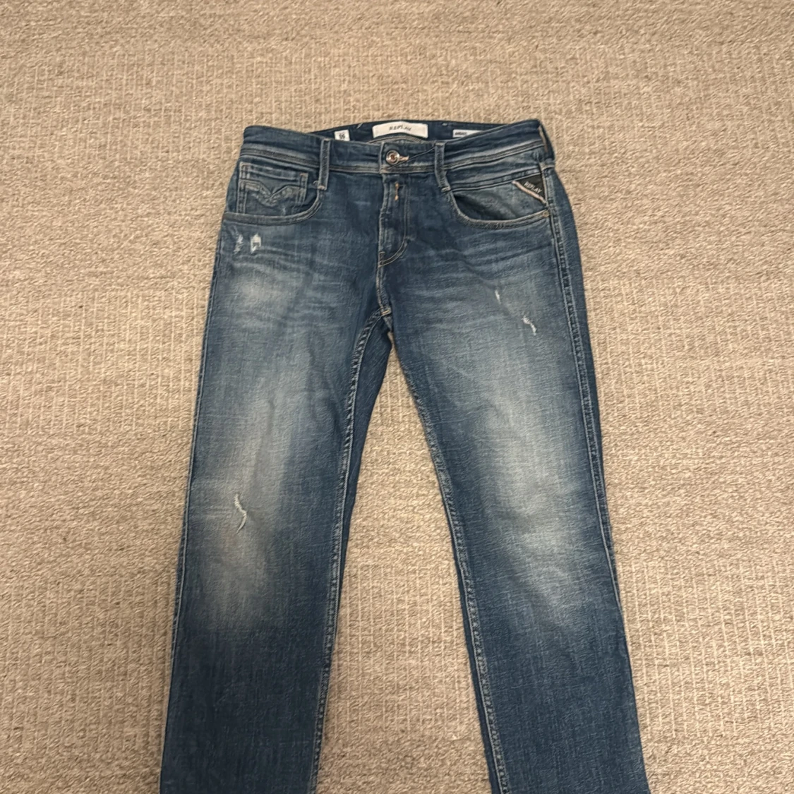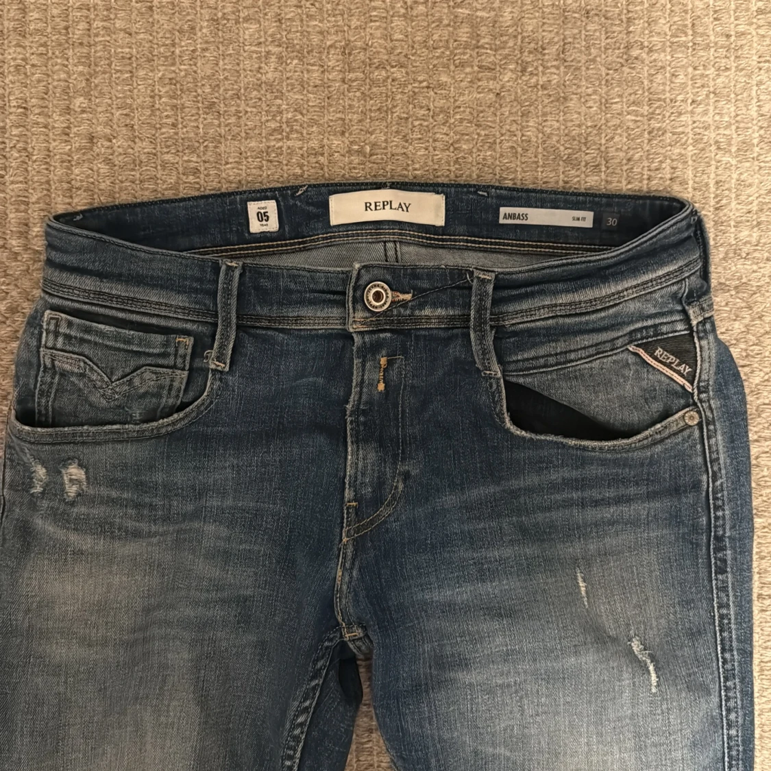 Säljer ett par Replay Anbass jeans i klassisk blå tvätt med slitningar och snyggt blekta partier. Jeansen har fem fickor, normal passform och raka ben. Märkesdetaljer på ficka och bak med Replay-lapp i läder. Perfekta för en avslappnad stil.