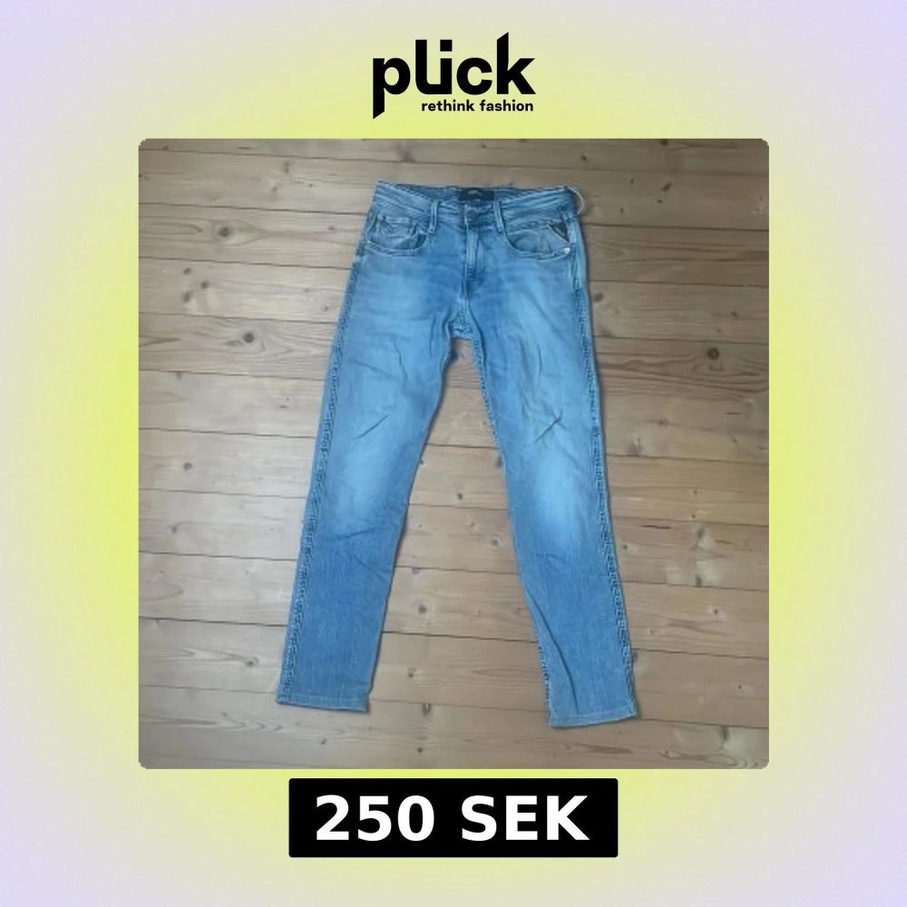 Tvär feta Replay anbass i storlek 30/32 i en unik och cool ljusblå färg. De är i fint skick förutom ett lite större och två små hål där bak vid rumpan