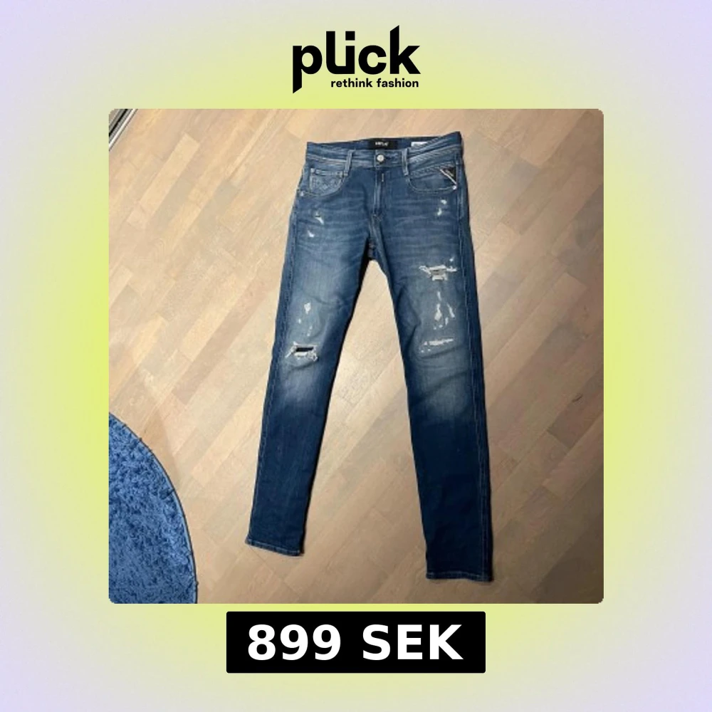 Snygga Replay Anbass jeans i blå tvätt med slitna detaljer på benen. Klassisk femficksmodell med dragkedja och knapp, samt Replay-logga på bakfickan. Slim fit och raka ben sitter jättebra bra skriv vid behov av mer bilder.