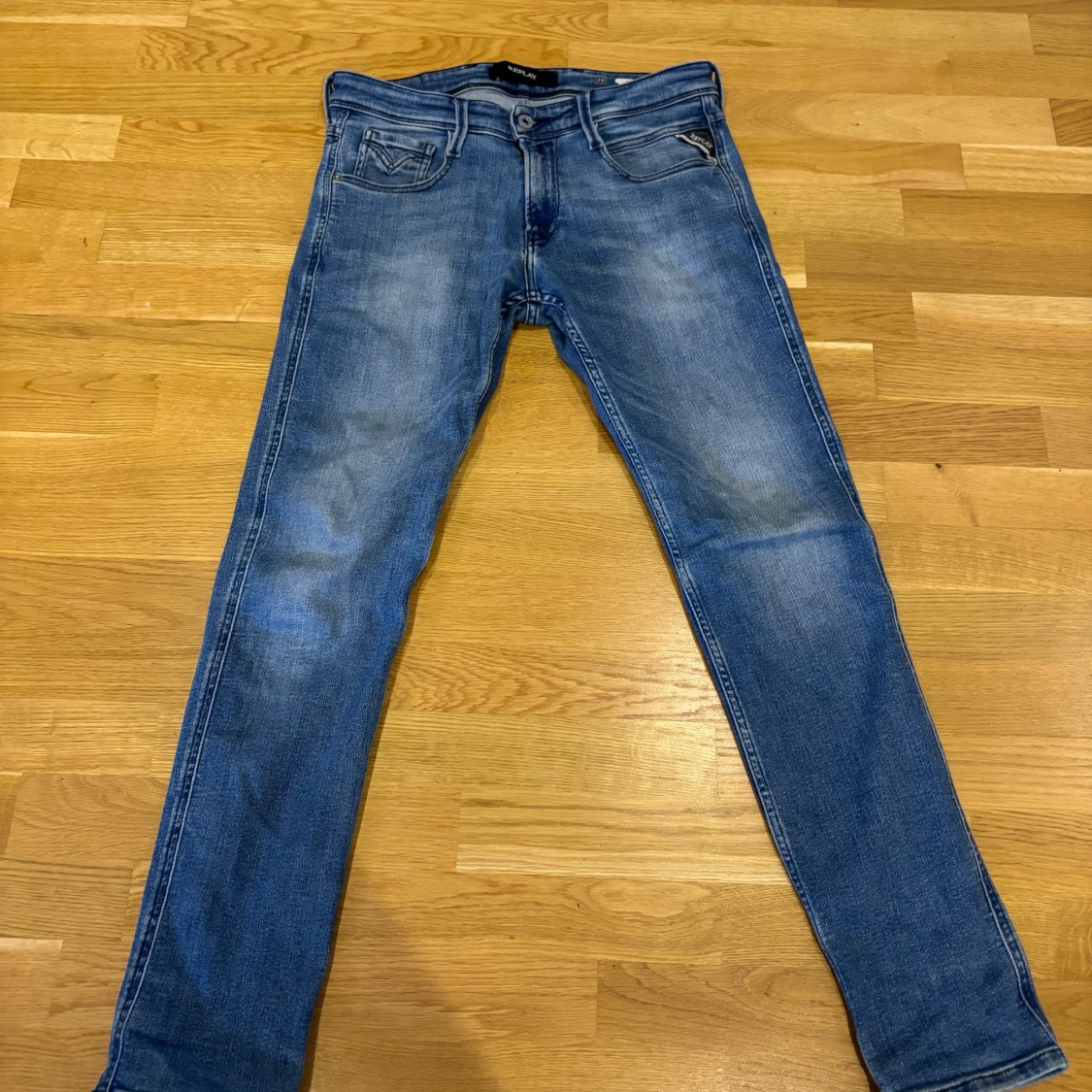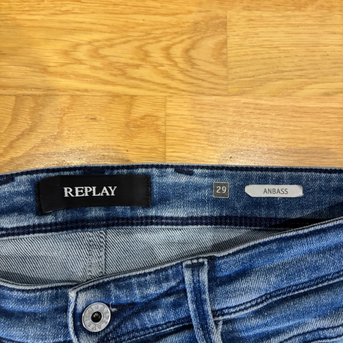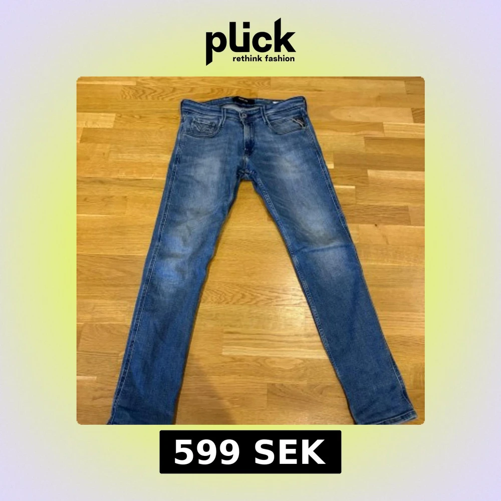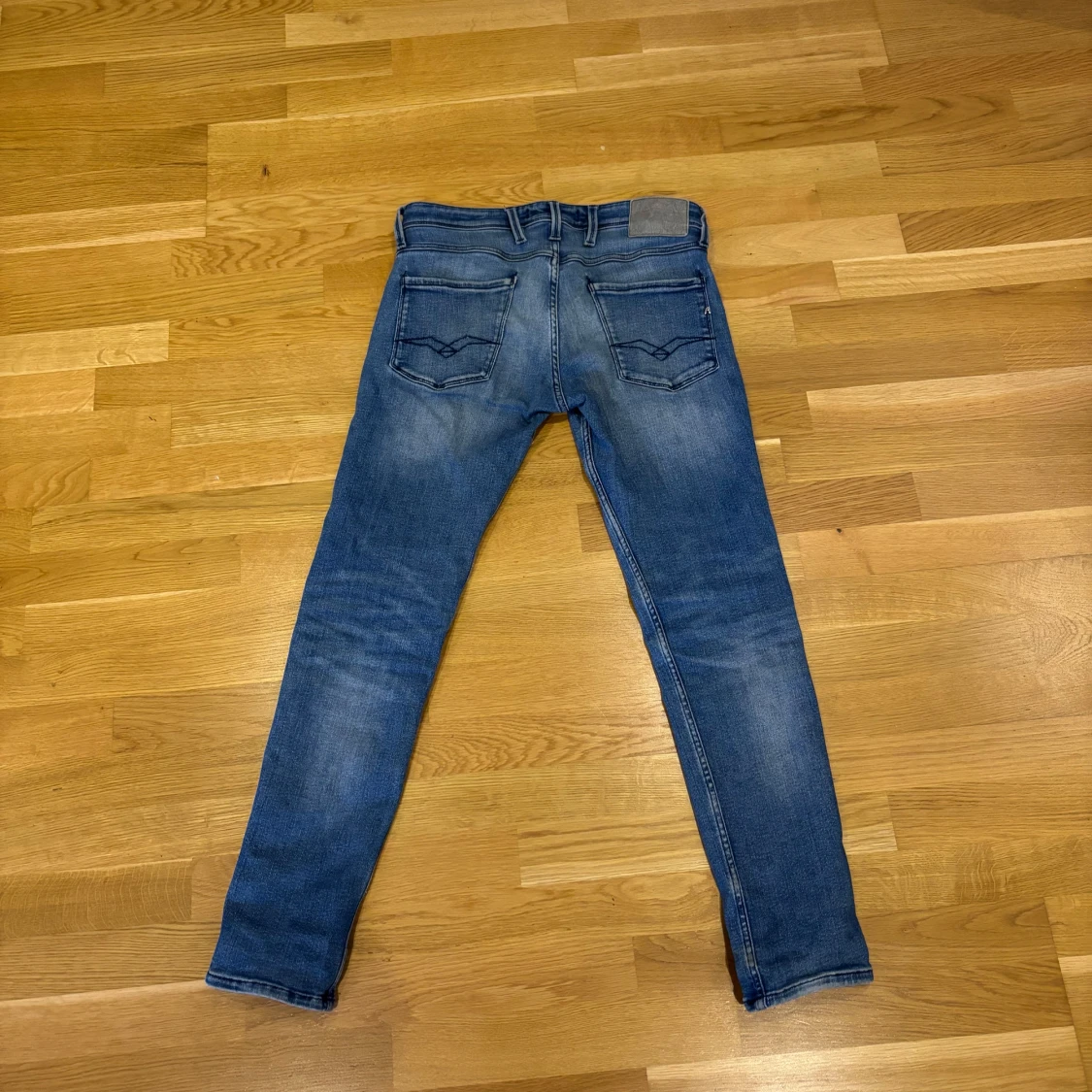 Säljer ett par Replay Anbass jeans i klassisk blå tvätt med snygga slitningar. Modellen är slim och har fem fickor, dragkedjegylf och tydliga sömmar. Jeansen är tillverkade i stretchig denim för en bekväm passform.
