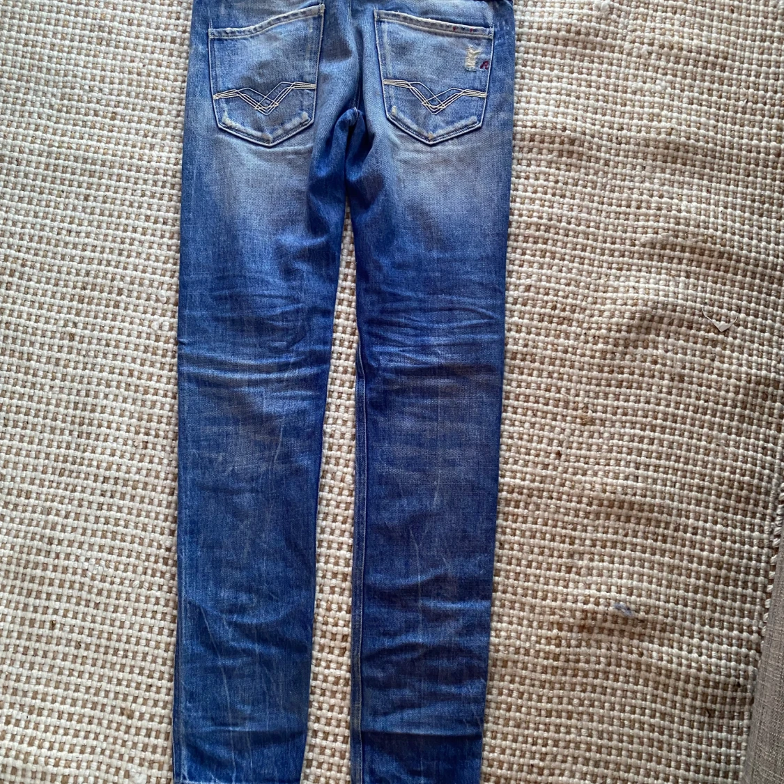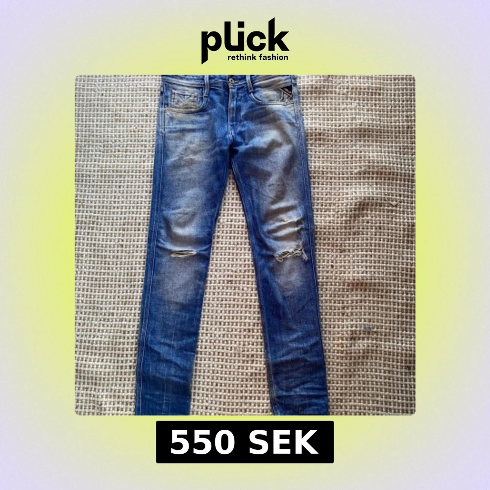 Säljer ett par Replay Anbass jeans i blå tvätt med slitningar och hål på benen. Slim fit med klassiska fem fickor och snygga detaljer på bakfickorna. Jeansen har dragkedjegylf och är tillverkade i stretchig bomullsdenim.