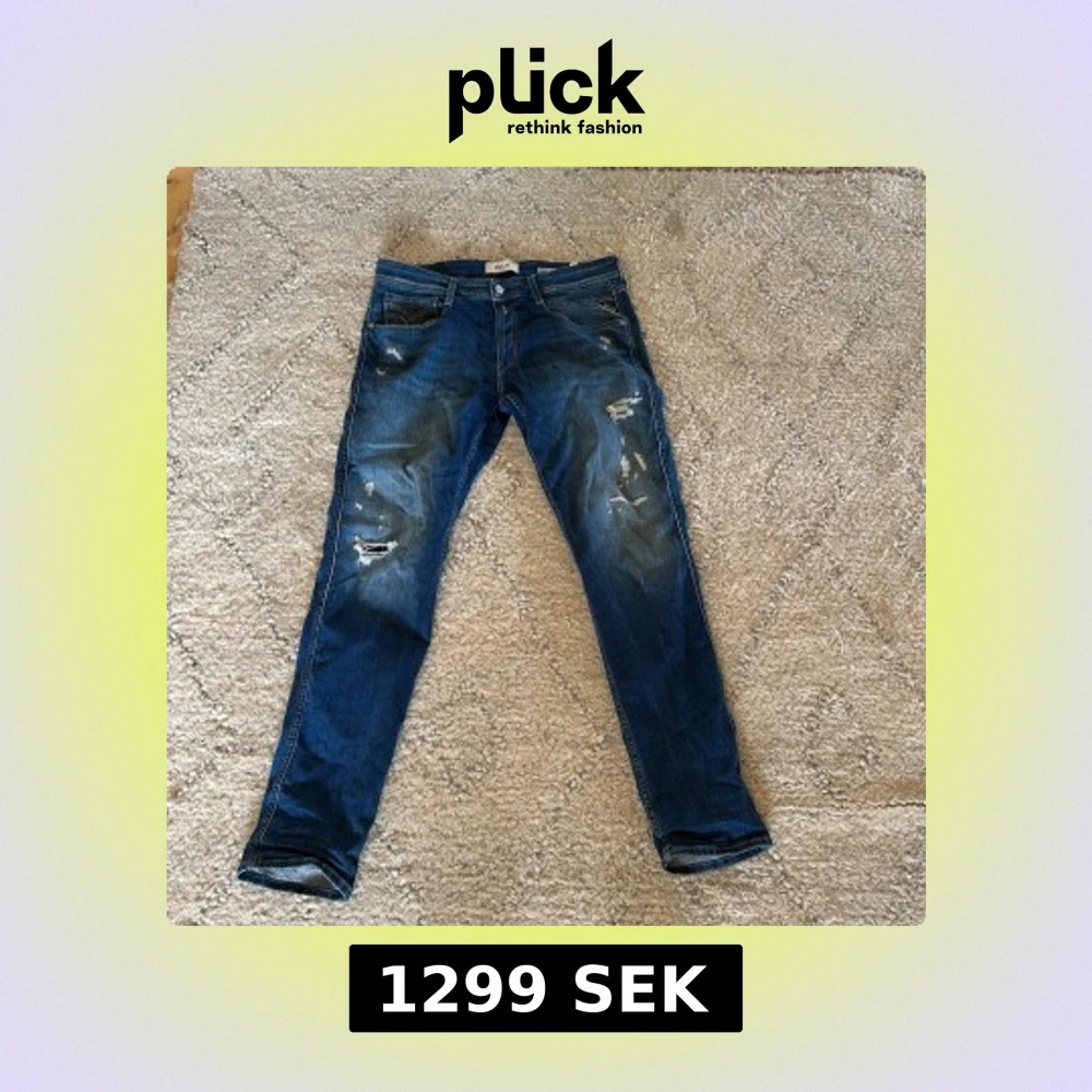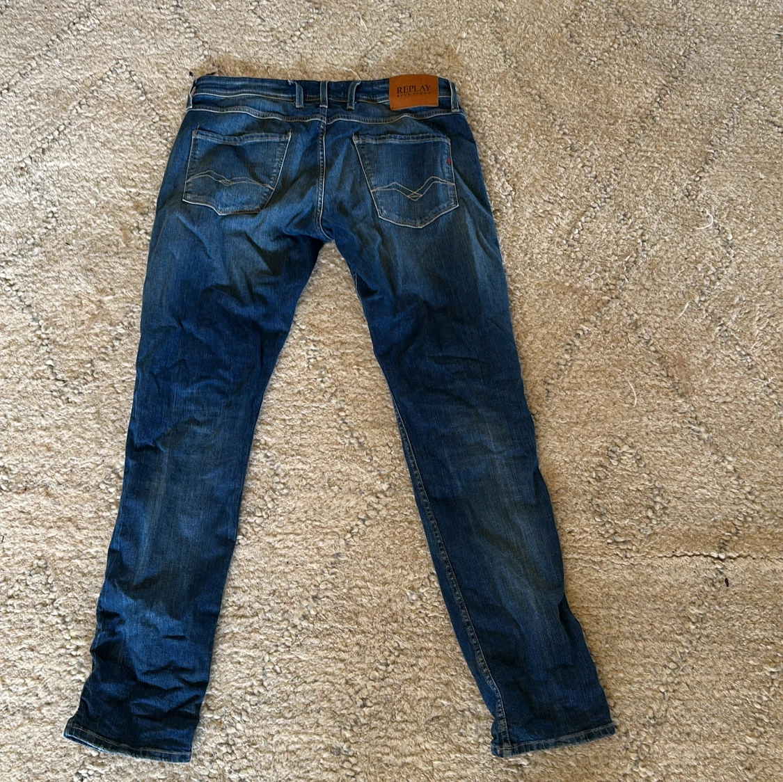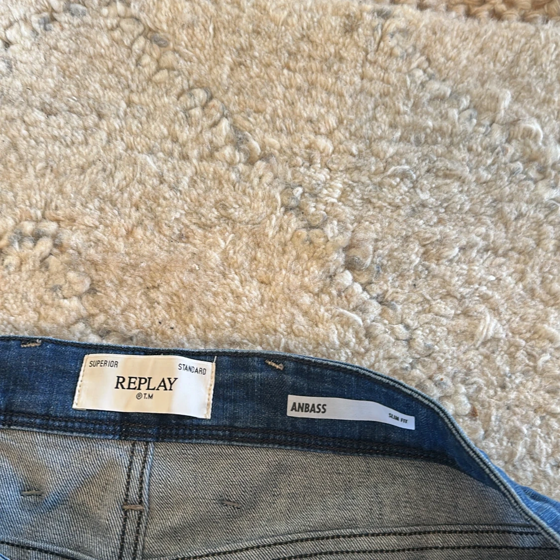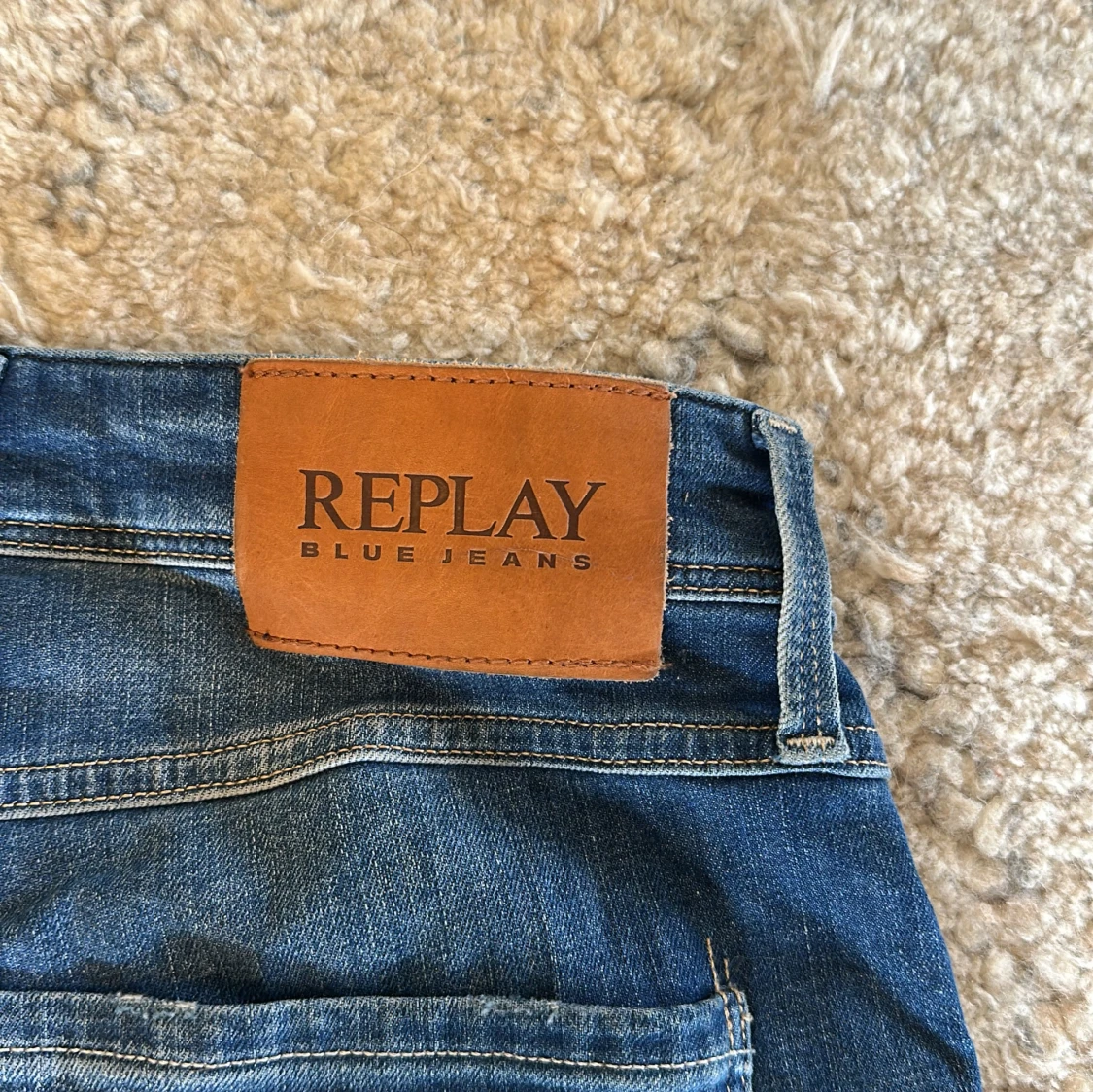 Snygga blå jeans från Replay, modell Anbass, med slim fit och slitna detaljer på benen. Klassisk femficksdesign, normal midja och läderpatch bak i midjan. Perfekta för dig som gillar en trendig och avslappnad look. Helt nya, nästan aldrig använda, as bra skick på dem, nypris 1899, mitt pris 1299. Storlek 34, 34. Säljer dom då dom är för stora för mig. Såklart inga defekter eller skador!