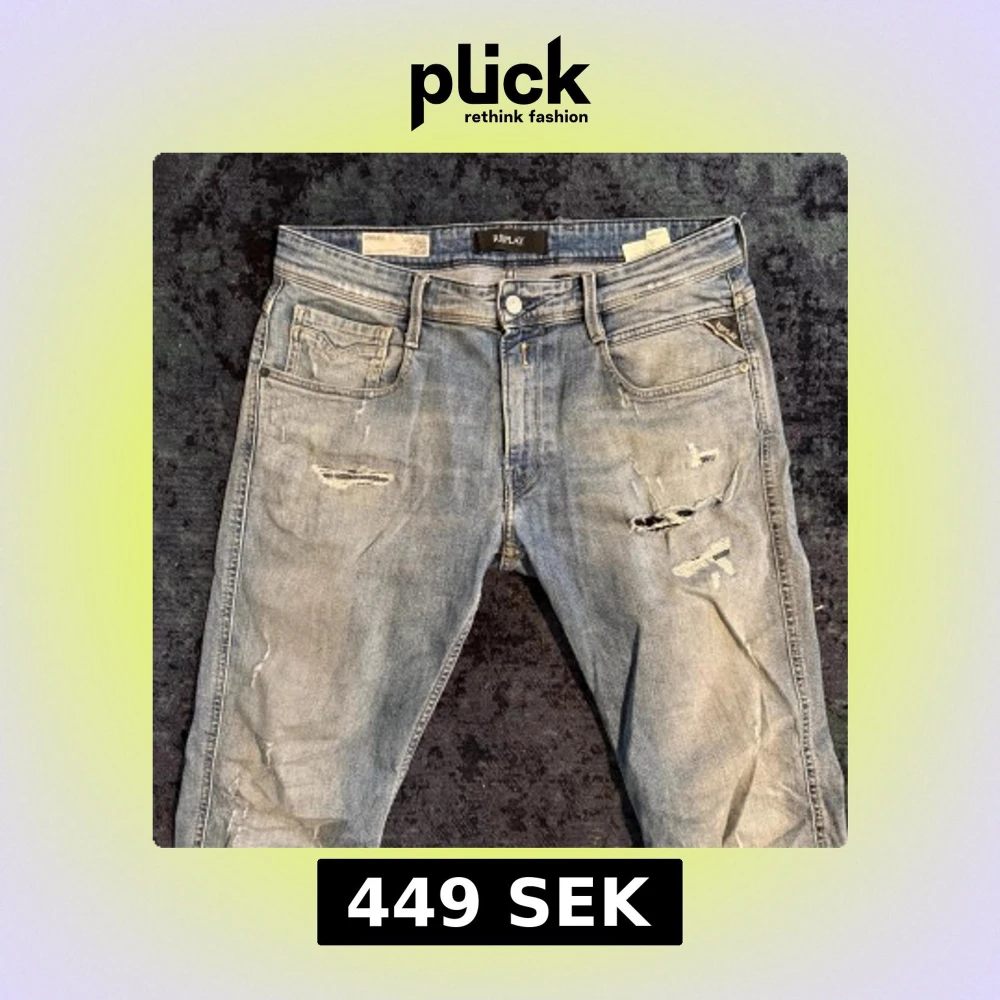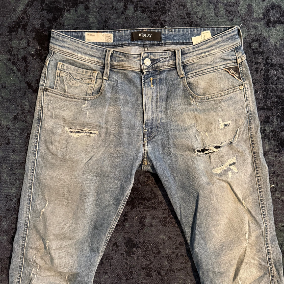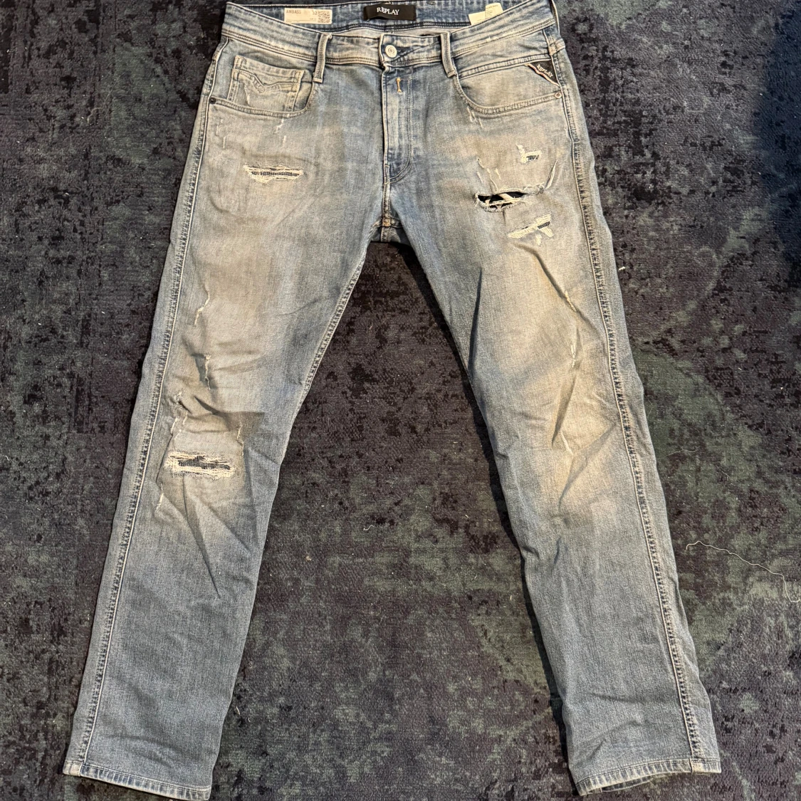 Replay jeans med slitningar | Storlek 32 | Modell Anbass | Använt skick men tillför till utseendet | Ett bältes fäste är skadat men lätt att sy ( Bild 3) | Lite stora på mig som är 172 | Tveka inte på att höra av dig vid frågor eller funderingar!