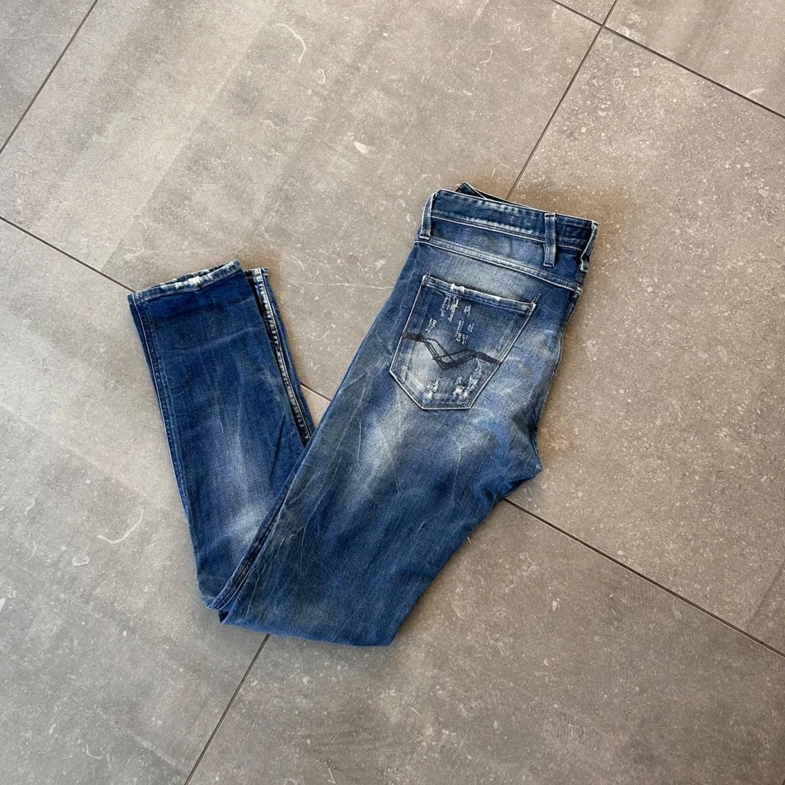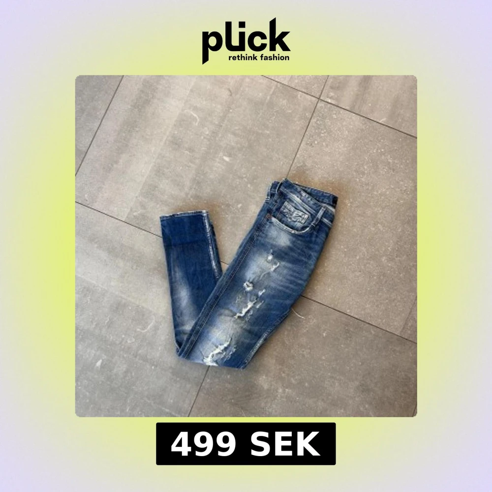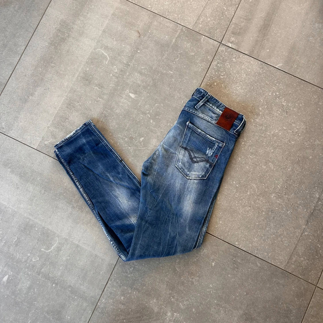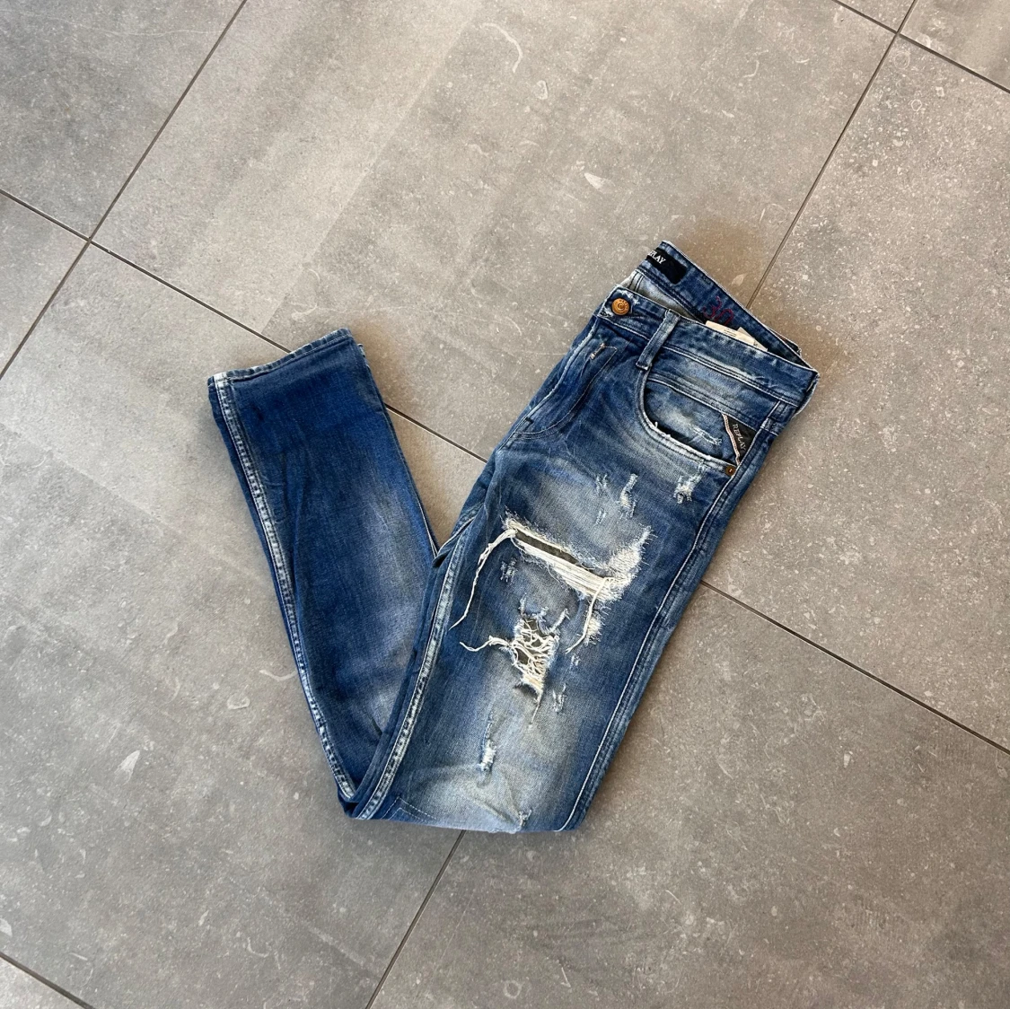 Säljer ett par blå jeans från Replay med snygga slitningar och trasiga detaljer framtill. Jeansen har klassisk femficksdesign, normal passform och är tillverkade i jeansmaterial. Stolek: W30/L32