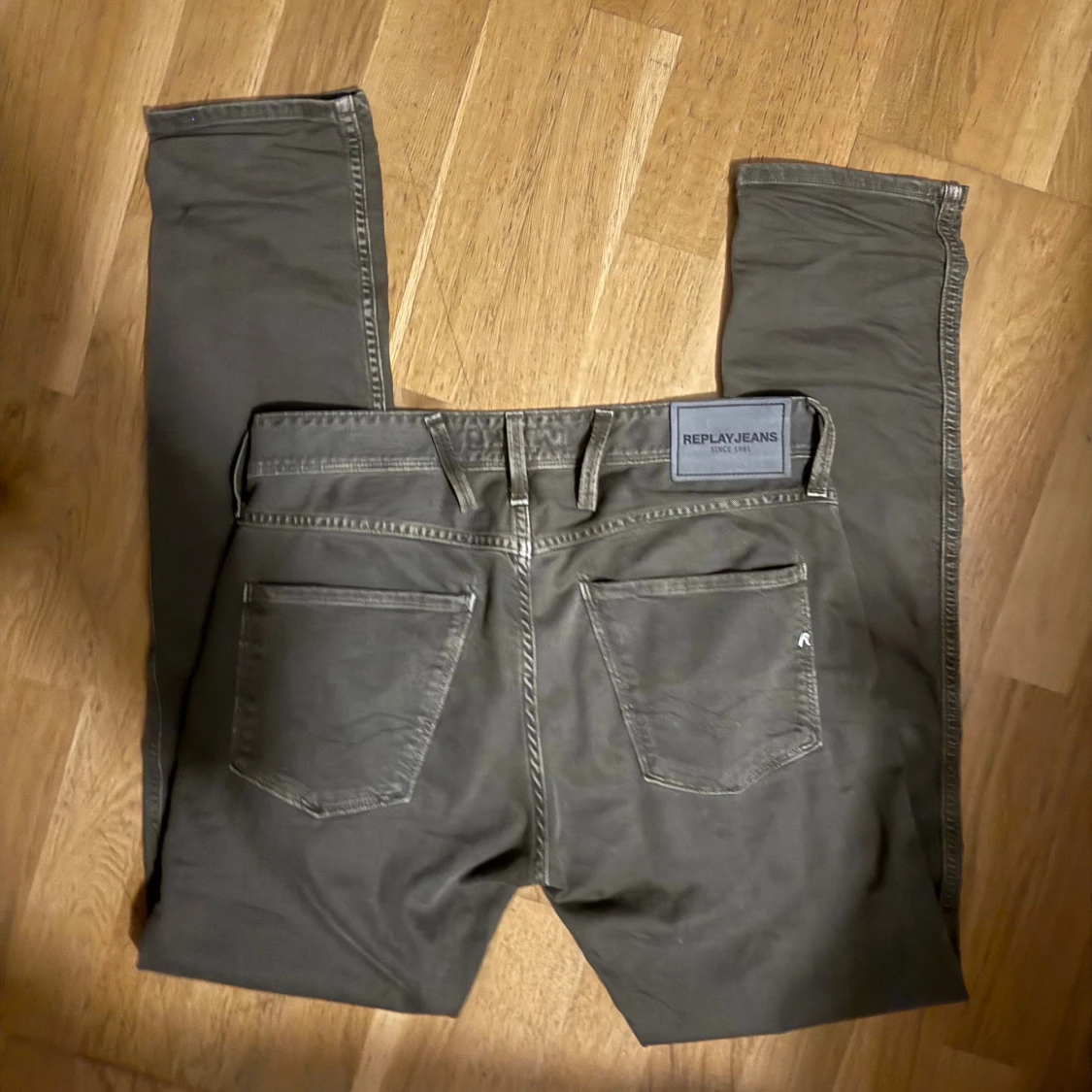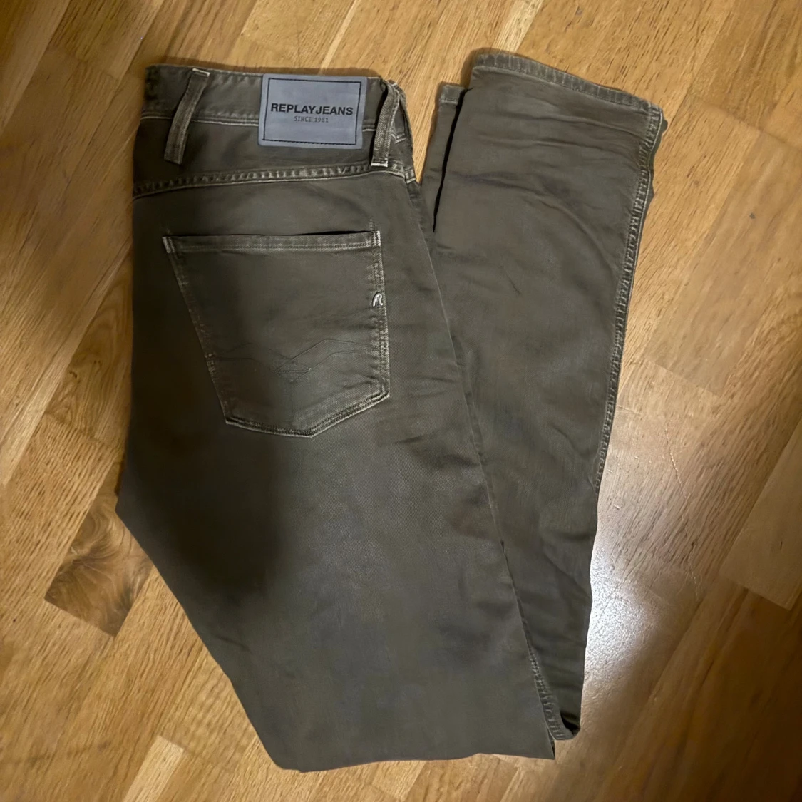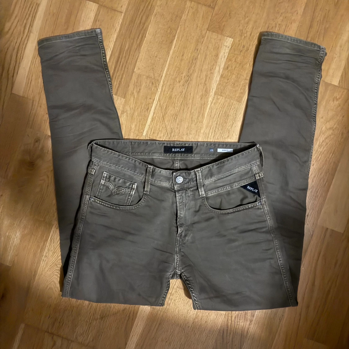Säljer ett par Replay Anbass jeans i grå färg med klassisk femficksdesign och snygga detaljer på bakfickorna. Jeansen har slim passform och är tillverkade i mjuk bomullsblandning med lite stretch för extra komfort. Perfekta för dig som gillar stilrena och moderna jeans. Grå/khaki.