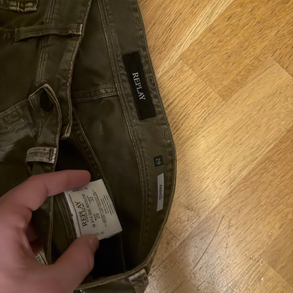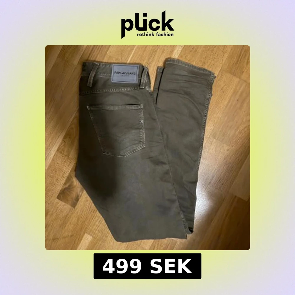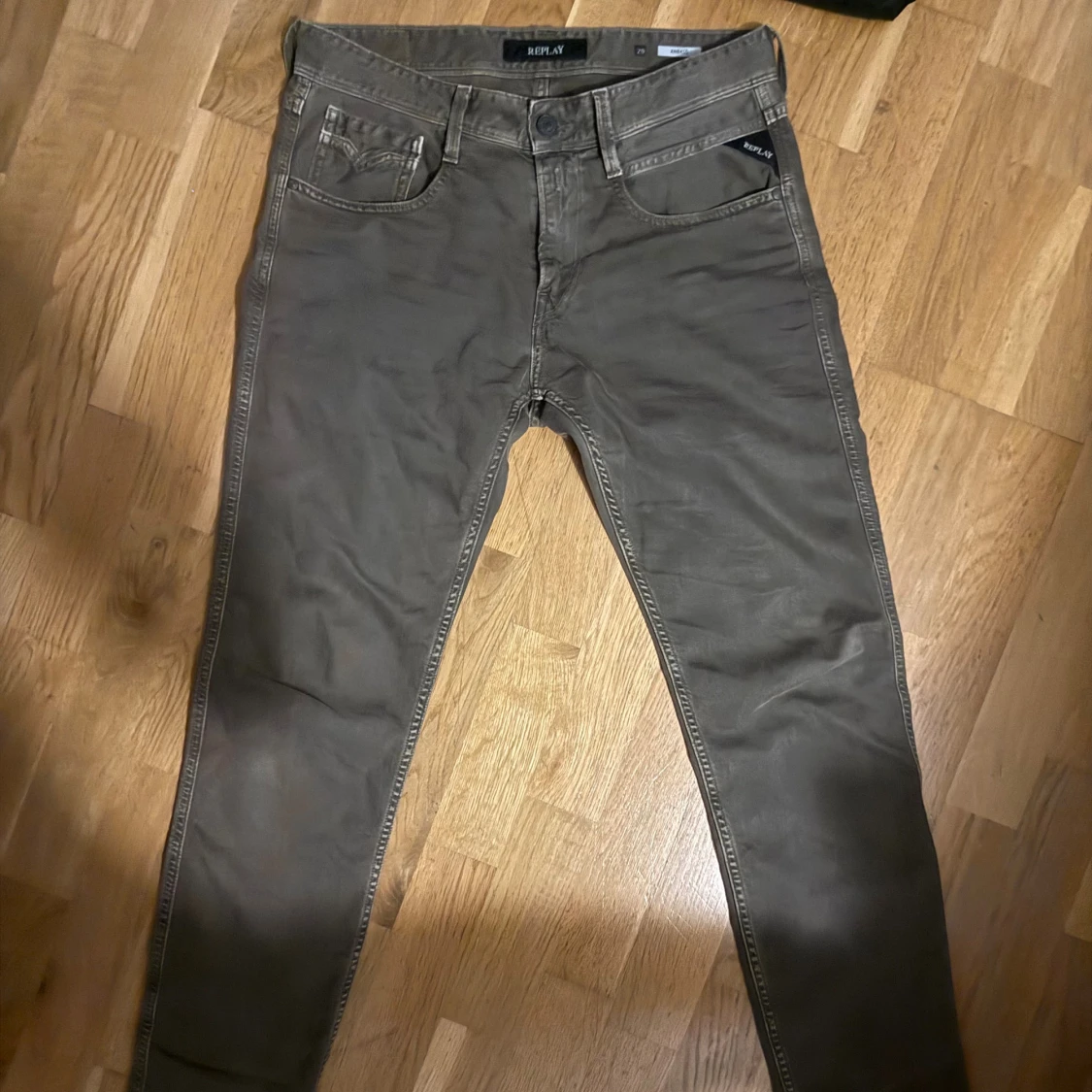 Säljer ett par Replay Anbass jeans i grå färg med klassisk femficksdesign och snygga detaljer på bakfickorna. Jeansen har slim passform och är tillverkade i mjuk bomullsblandning med lite stretch för extra komfort. Perfekta för dig som gillar stilrena och moderna jeans. Grå/khaki.