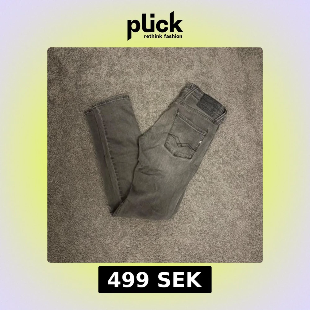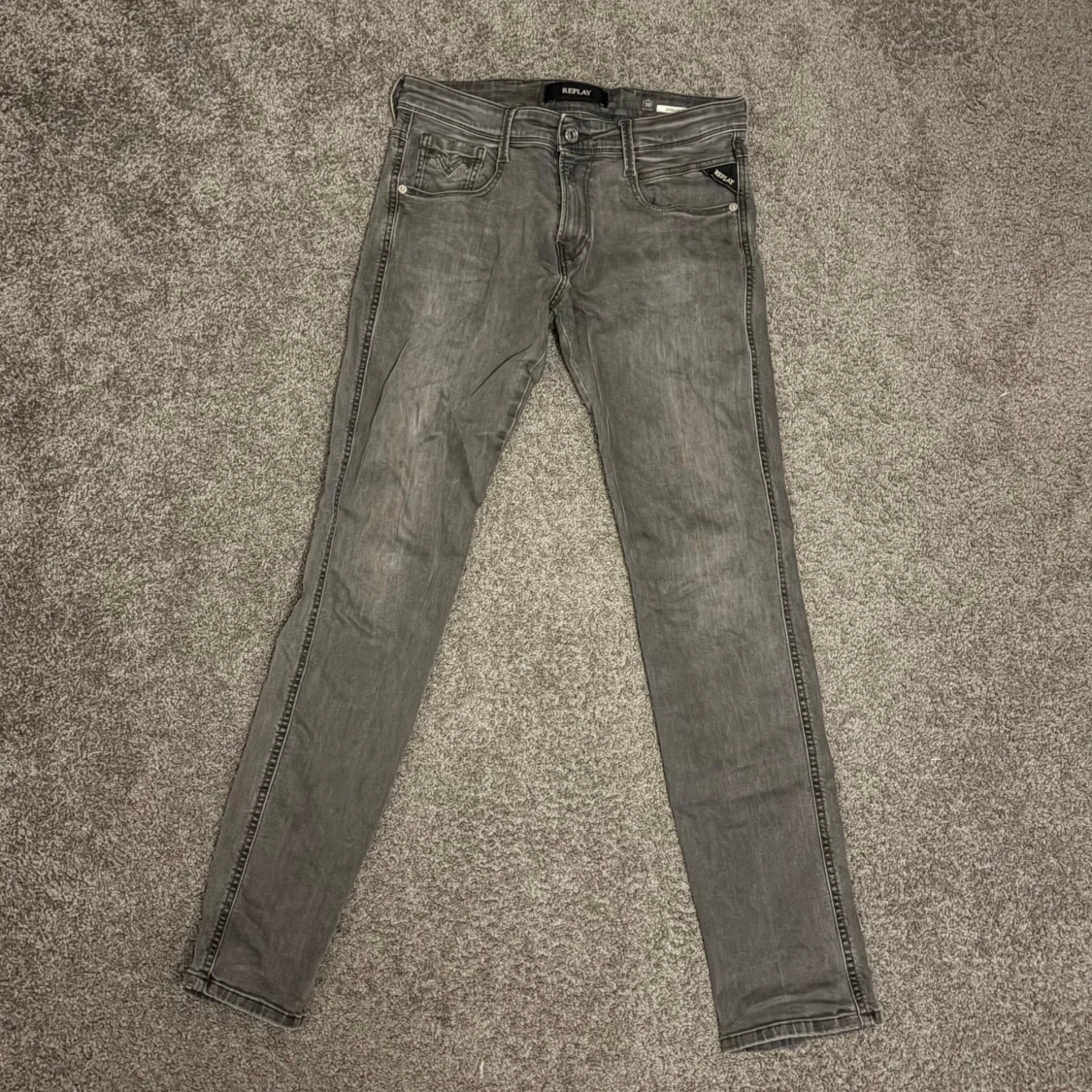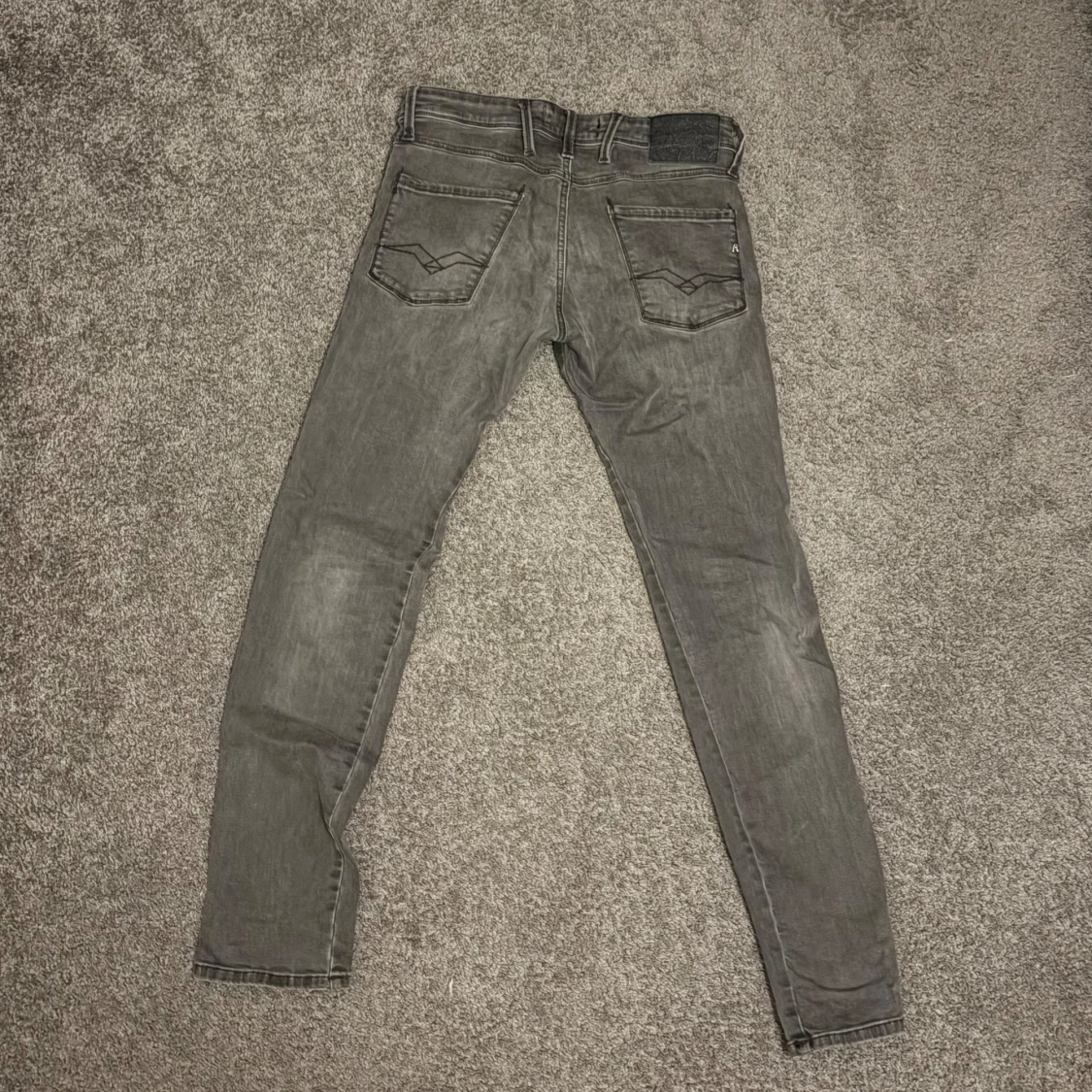Säljer ett par grå Replay Anbass jeans i slim fit med klassisk femficksdesign och snygga detaljer på bakfickorna. Jeansen har en smal passform och är tillverkade i mjukt bomullsmaterial med lite stretch för extra komfort.