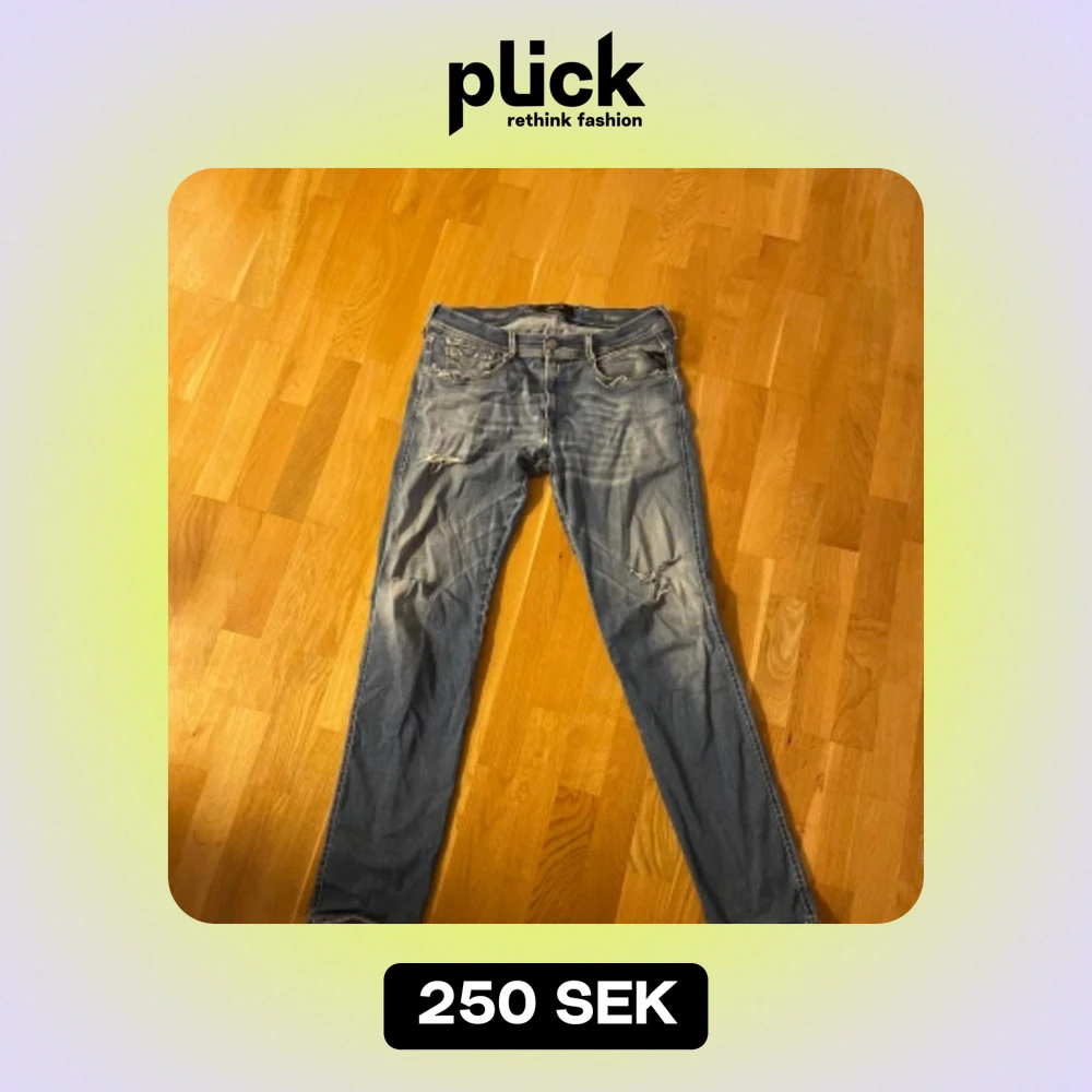 Replay anbass, väldigt slitna då de är många hål i byxorna( kolla bilderna ). Finns också ett hål på baksidan av byxorna men den bilden fick inte plats i annonsen, bara att höra av sig om frågor och funderingar.