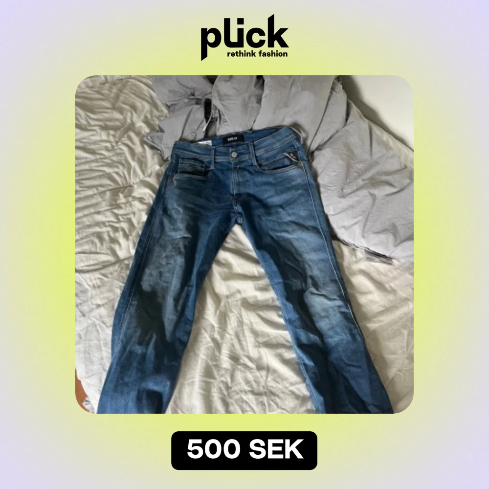 Säljer nu mina replay jeans i färgen ljusblå då dom har blivit lite små. Passformen är sjukt bra och dom ser lite skrynkliga ut men det är bara pågrund av ljuset, bara att säga till vid funderingar.