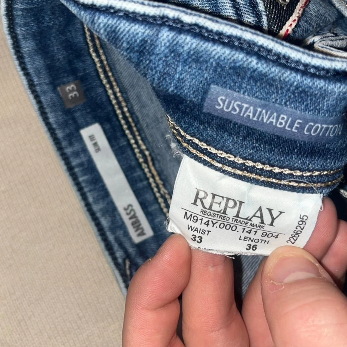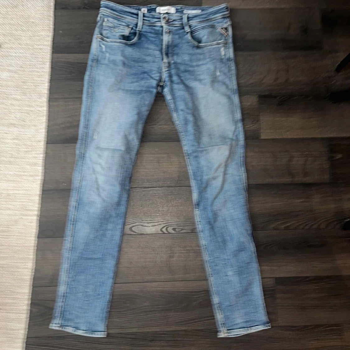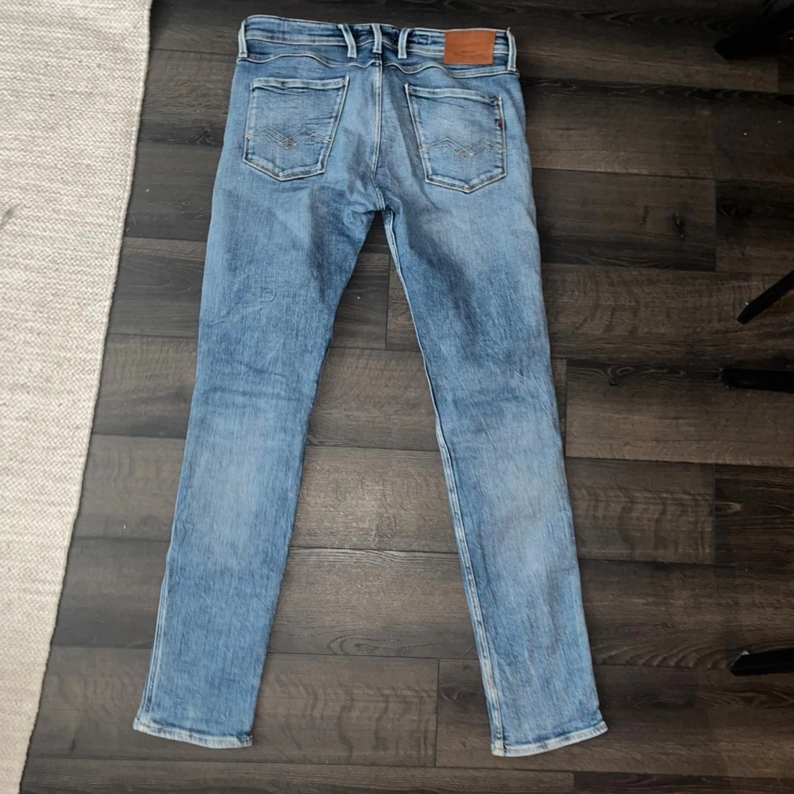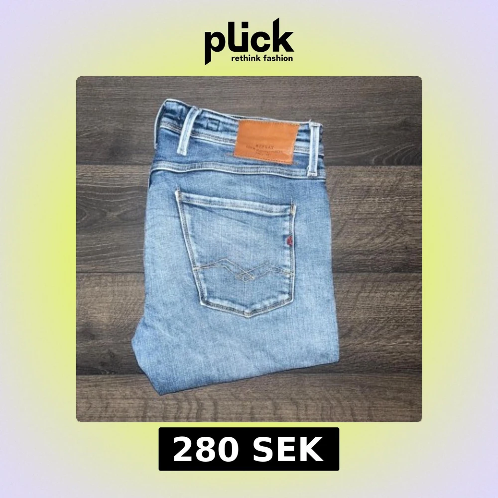 Snygga ljusblå Replay Anbass jeans med klassisk femficksdesign och läderpatch bak. Jeansen har smal passform och raka ben. möjligtvis uppsydda då jag tycker 110cm är lite kort för att vara L36 så håll koll på måtten :)Midja 44cm, längd 110cm. Ifall det inte finns någon bild i annonsen där jag bär plaggen jag säljer så är det för att jag ej kan ha storleken heller passformen, så kolla måtten för storlek och googla på modellnamnet för passform 😉S2