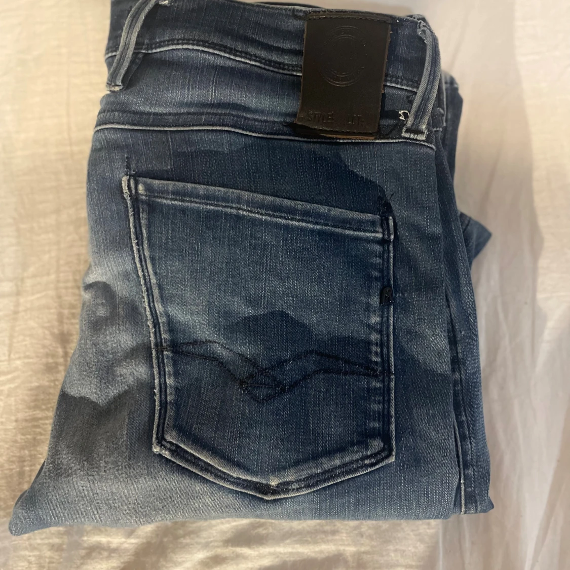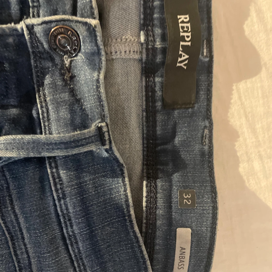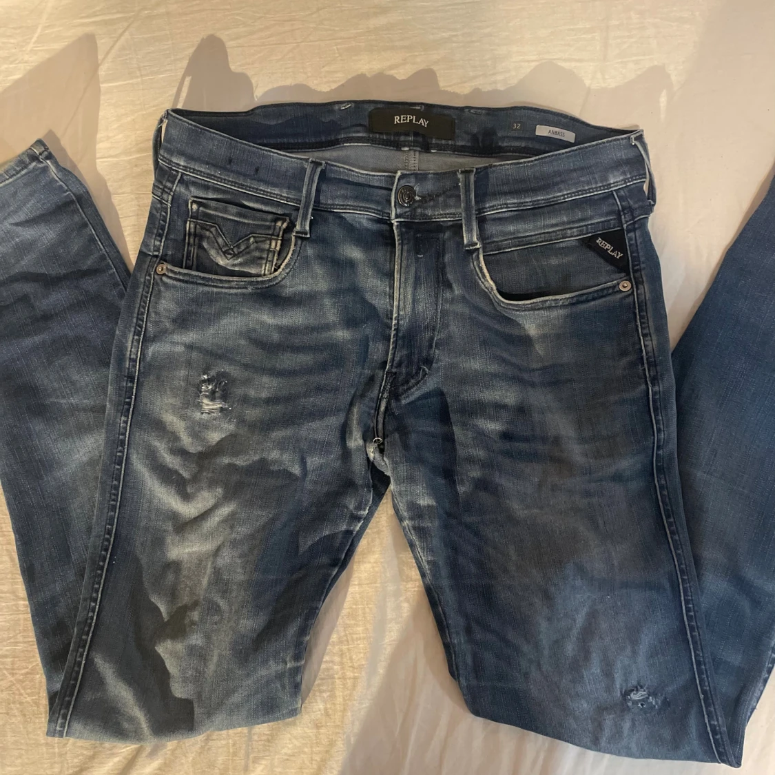 Snygga Replay Anbass jeans i blå tvätt med slitningar och lätt urtvättad look. Klassisk femficksmodell med raka ben och normal passform. Jeansen har detaljerade sömmar och Replay-logga på fickan. Perfekta för dig som gillar en avslappnad men stilren vibe.