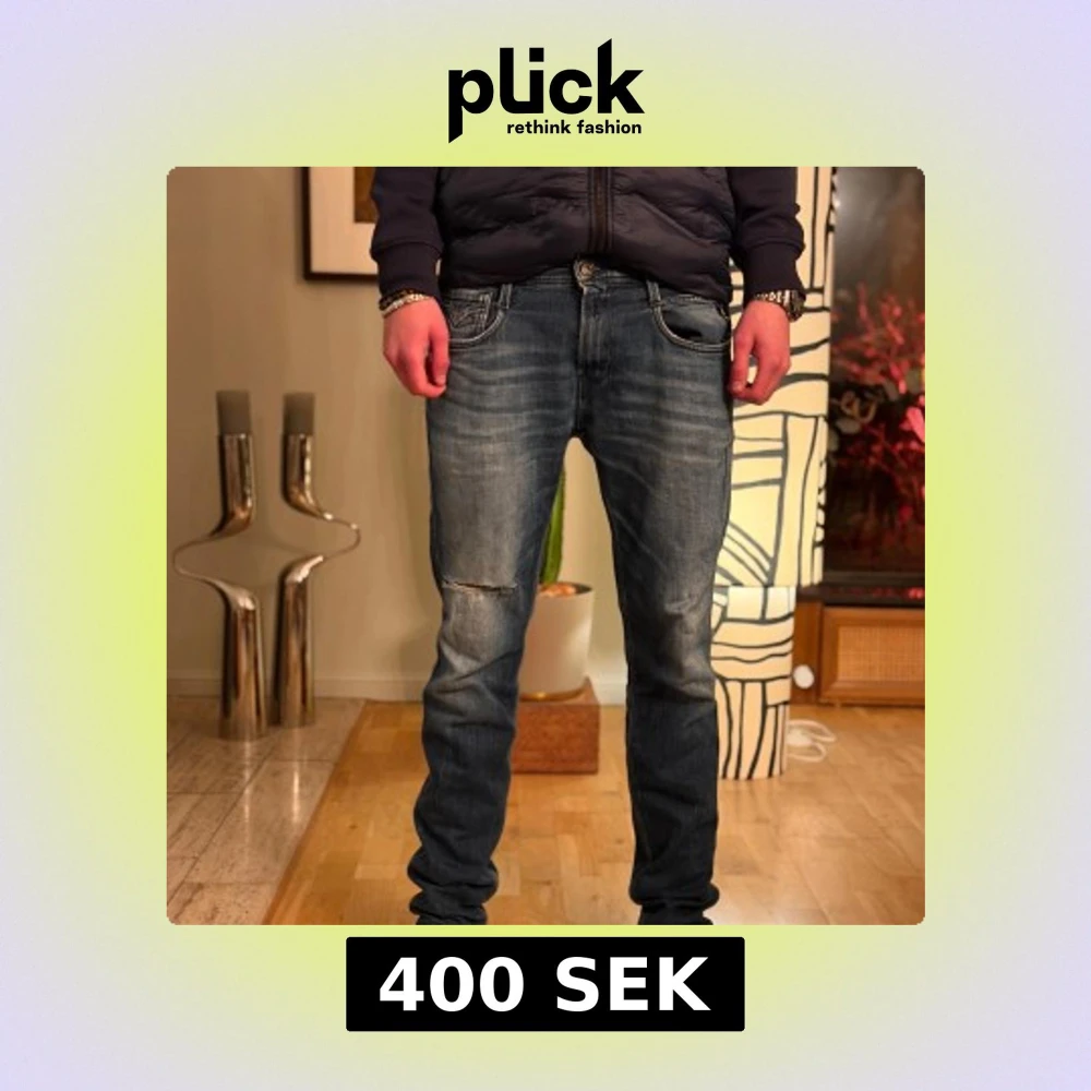 Säljer ett par Replay Anbass jeans i blå tvätt med snygga slitningar och en liten reva på ena benet. Klassisk femficksmodell med raka ben och tydliga sömmar på bakfickorna. Jeansen har normal passform och är tillverkade i mjukt denimtyg.