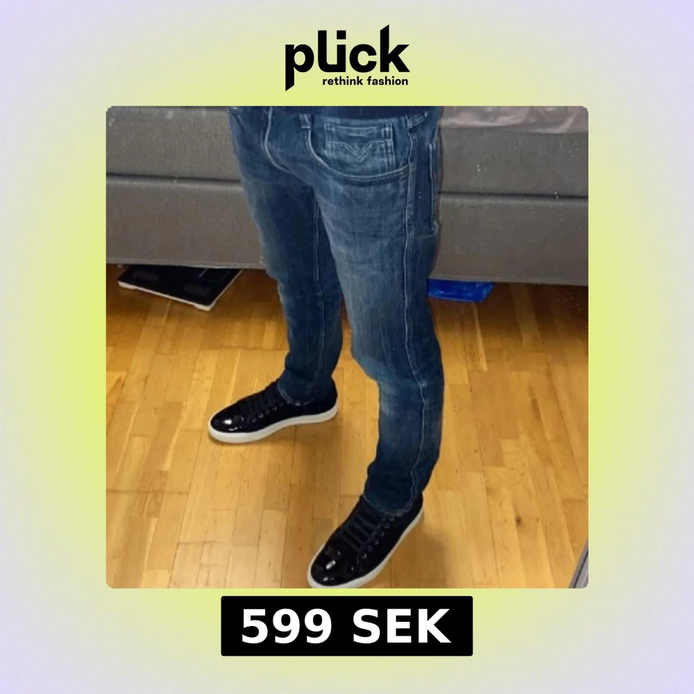 Säljer ett par snygga Replay Anbass jeans i mörkblå tvätt med slitningar. Modellen har smal passform och klassisk femficksdesign. Jeansen är tillverkade i stretchig bomull för extra komfort och har diskreta Replay-detaljer på bakfickan.