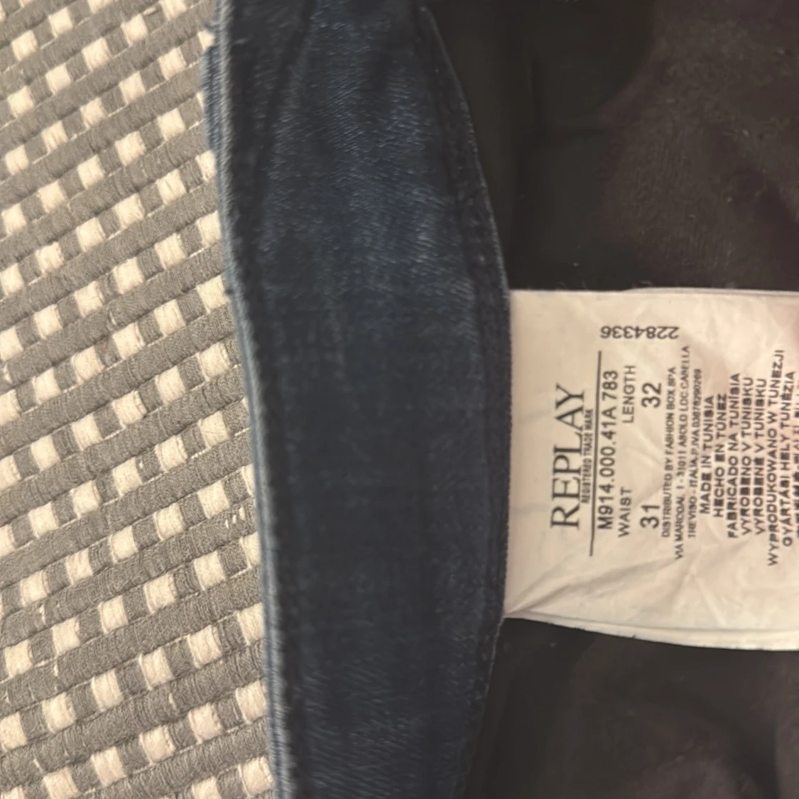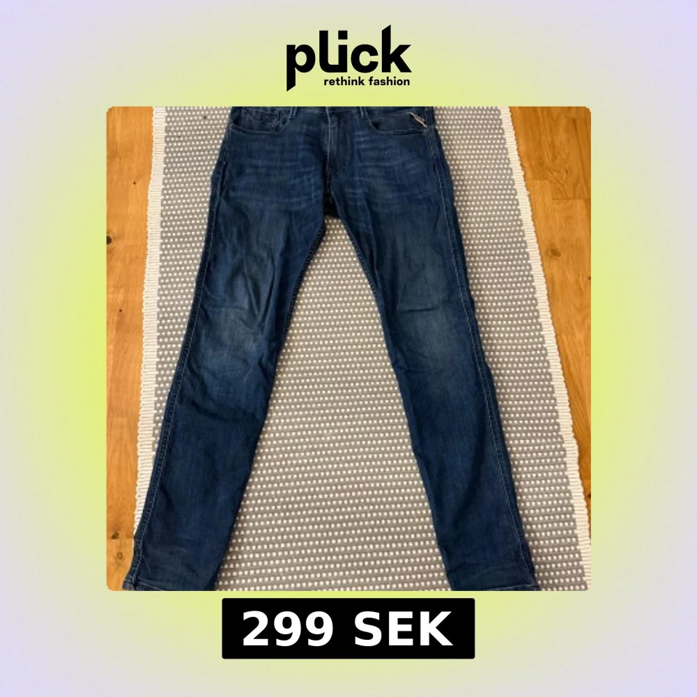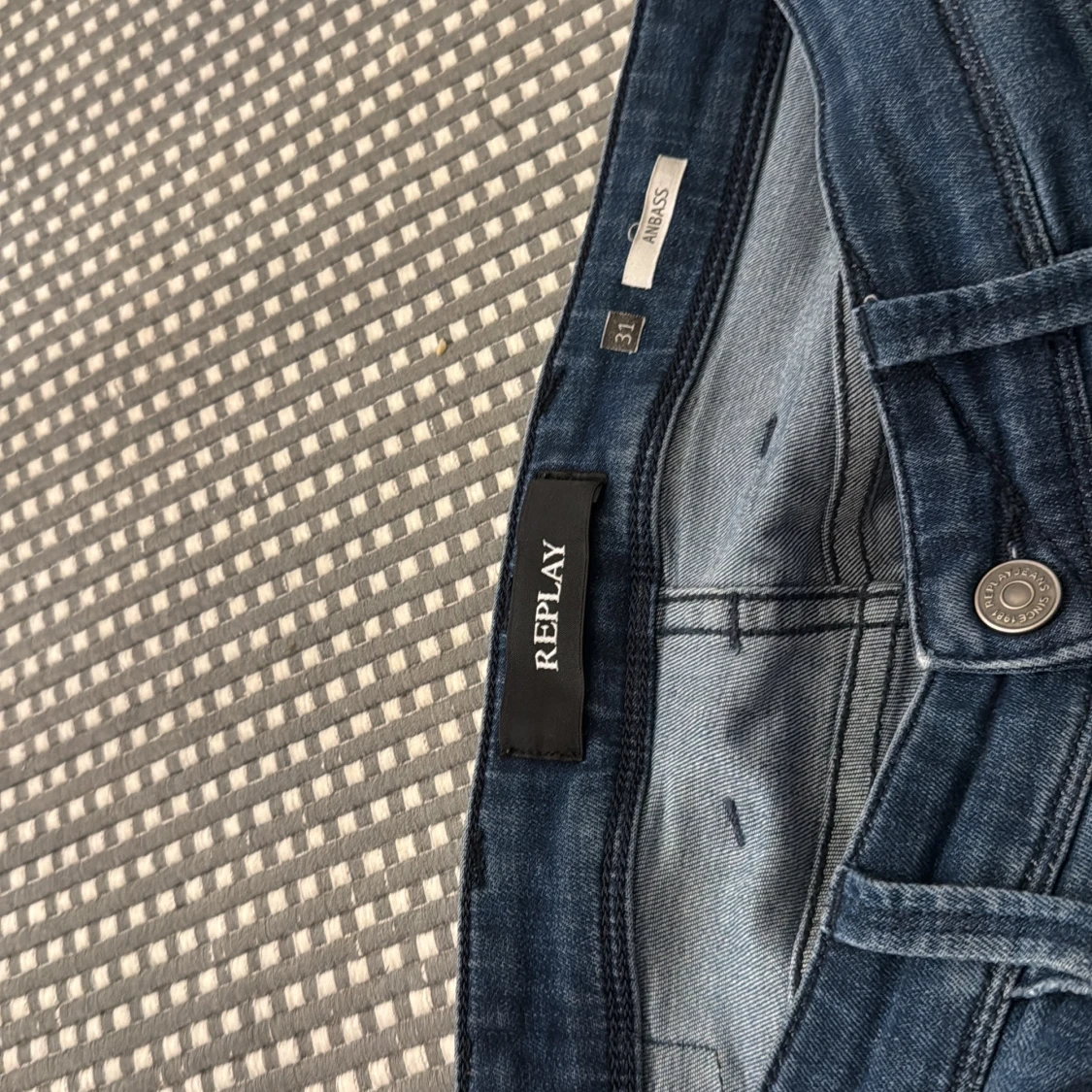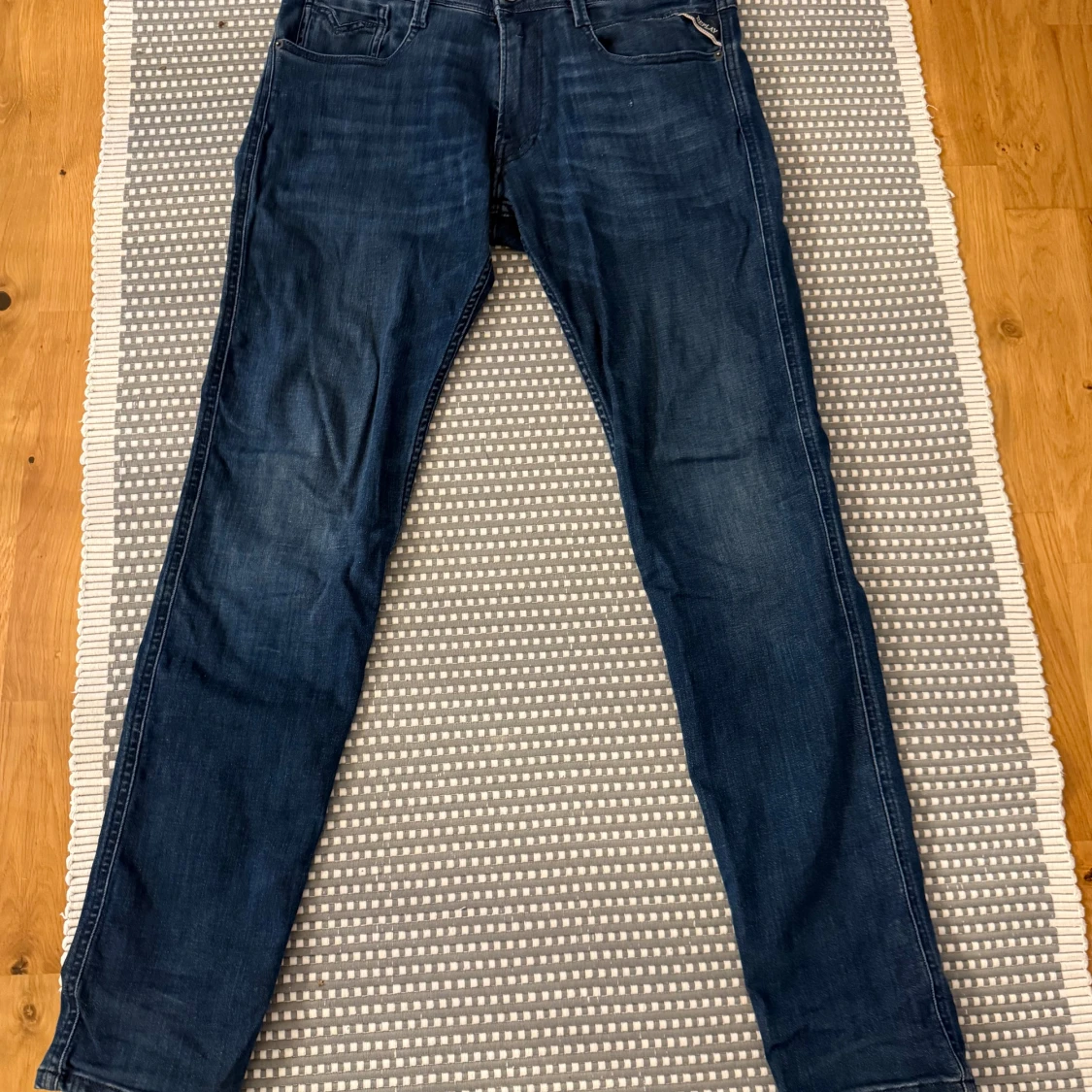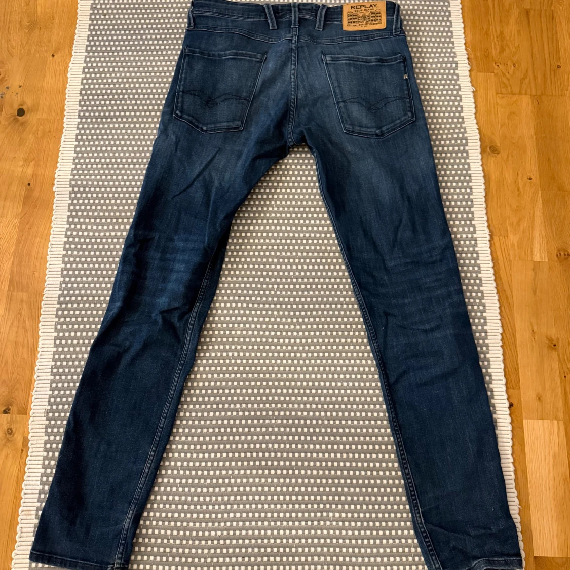 Säljer ett par snygga Replay Anbass jeans i mörkblå tvätt. Modellen har smal passform, klassiska fem fickor och diskreta slitningar. Jeansen är tillverkade i stretchig denim för extra komfort och har Replay-logga på bakfickan.