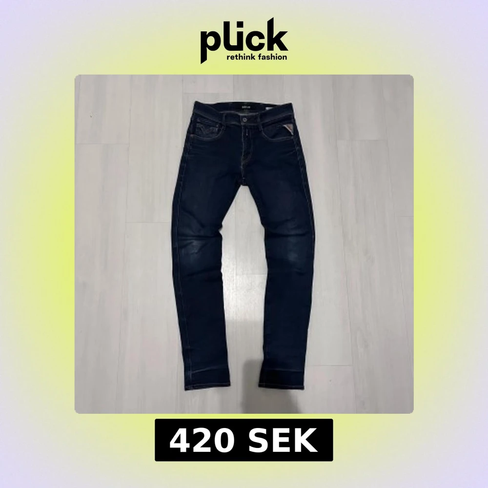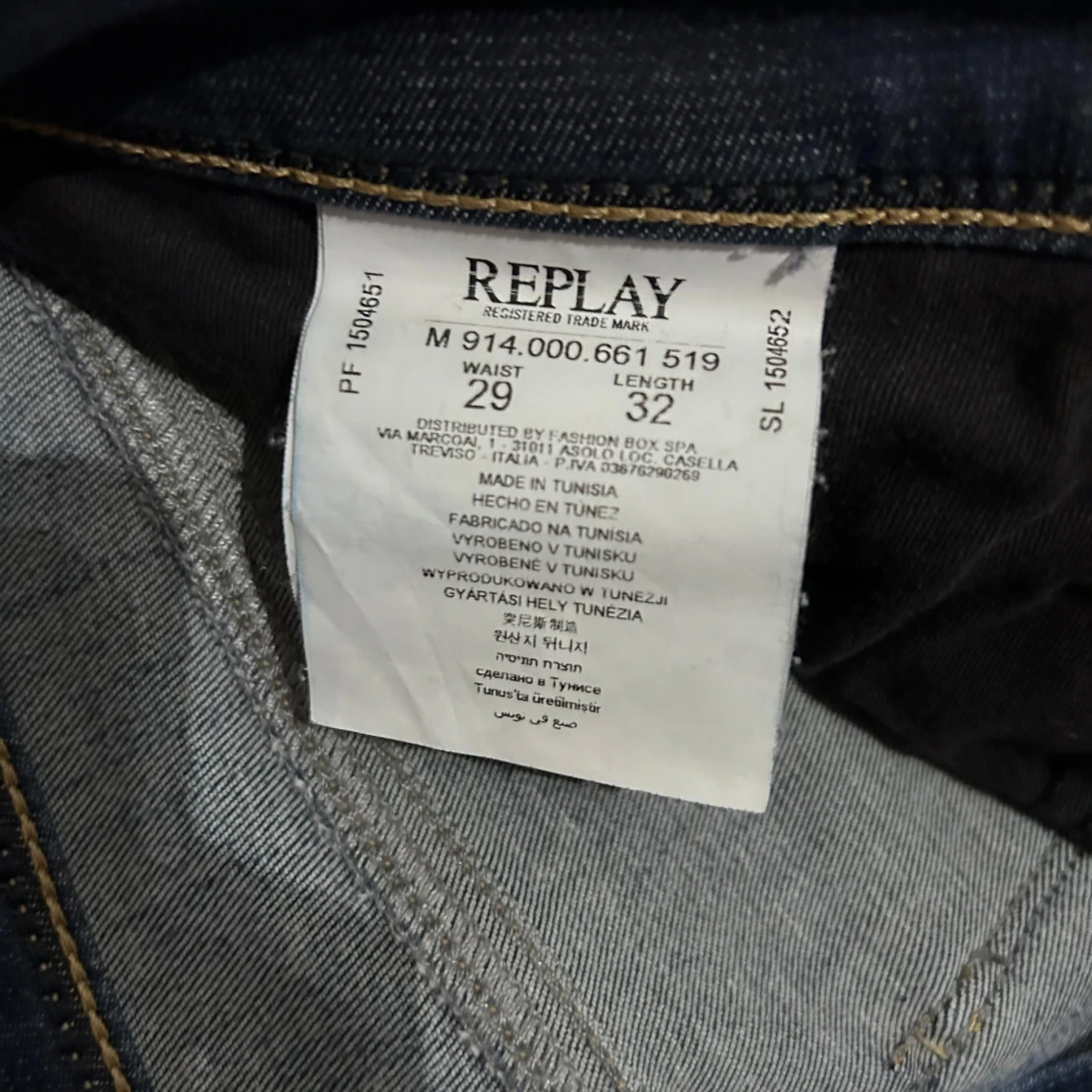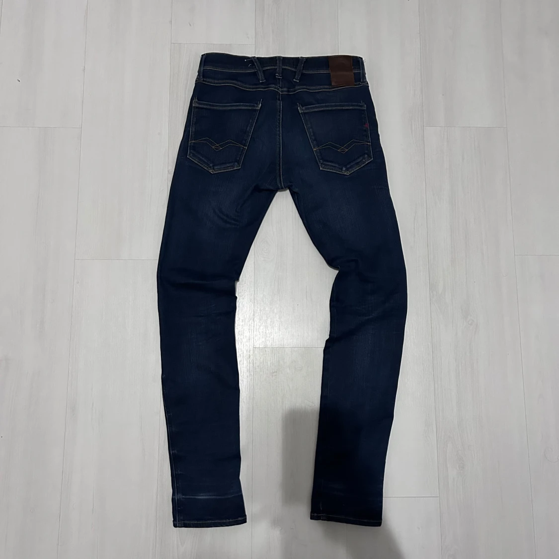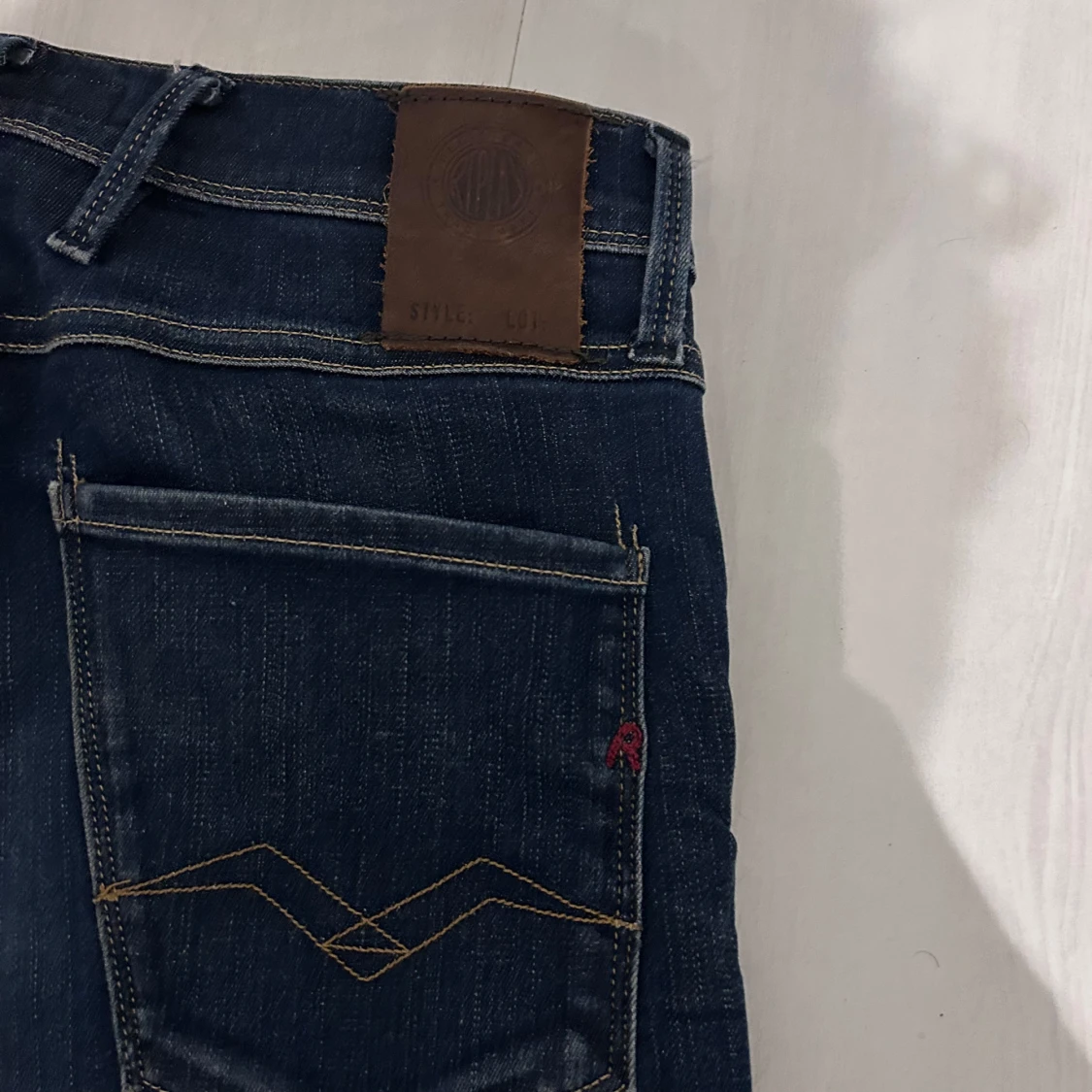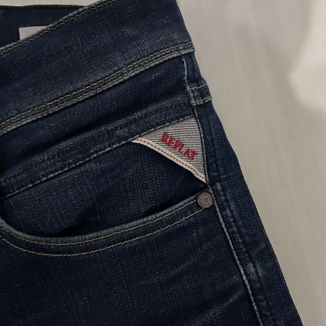 Snygga Replay Anbass jeans i mörkblå tvätt med klassisk femficksdesign och kontrastsömmar. Modellen har en slim passform och raka ben, med Replay-logga på fickan. Perfekt för dig som gillar stilrena och moderna jeans.
