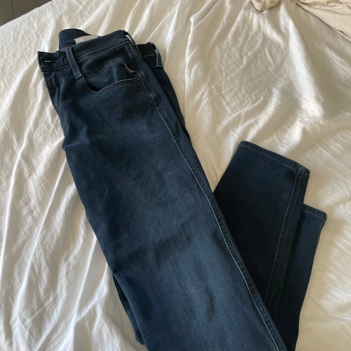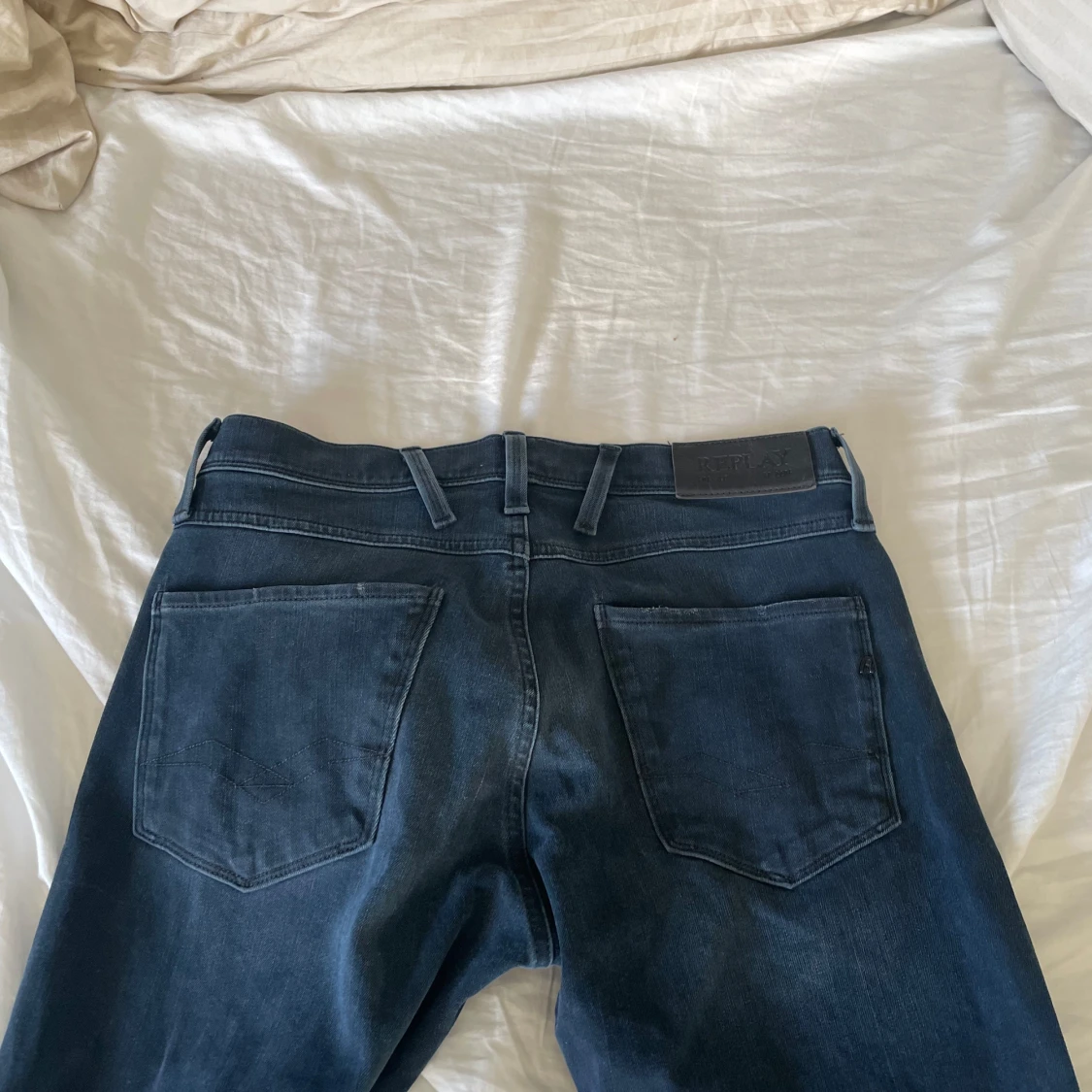 Säljer ett par snygga Replay Anbass jeans i mörkblå tvätt. Klassisk femficksmodell med raka ben och normal passform. Jeansen har bälteshällor och är tillverkade i mjukt denimtyg som sitter skönt hela dagen.