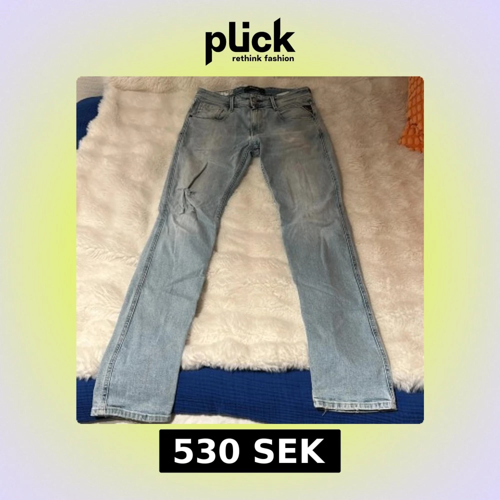 Säljer ett par Replay Anbass jeans i ljusblå tvätt med klassisk femficksdesign och snygga slitningar. Jeansen har raka ben och normal passform, med Replay-logga på fickan och läderpatch bak i midjan. Perfekta för en avslappnad och trendig look.