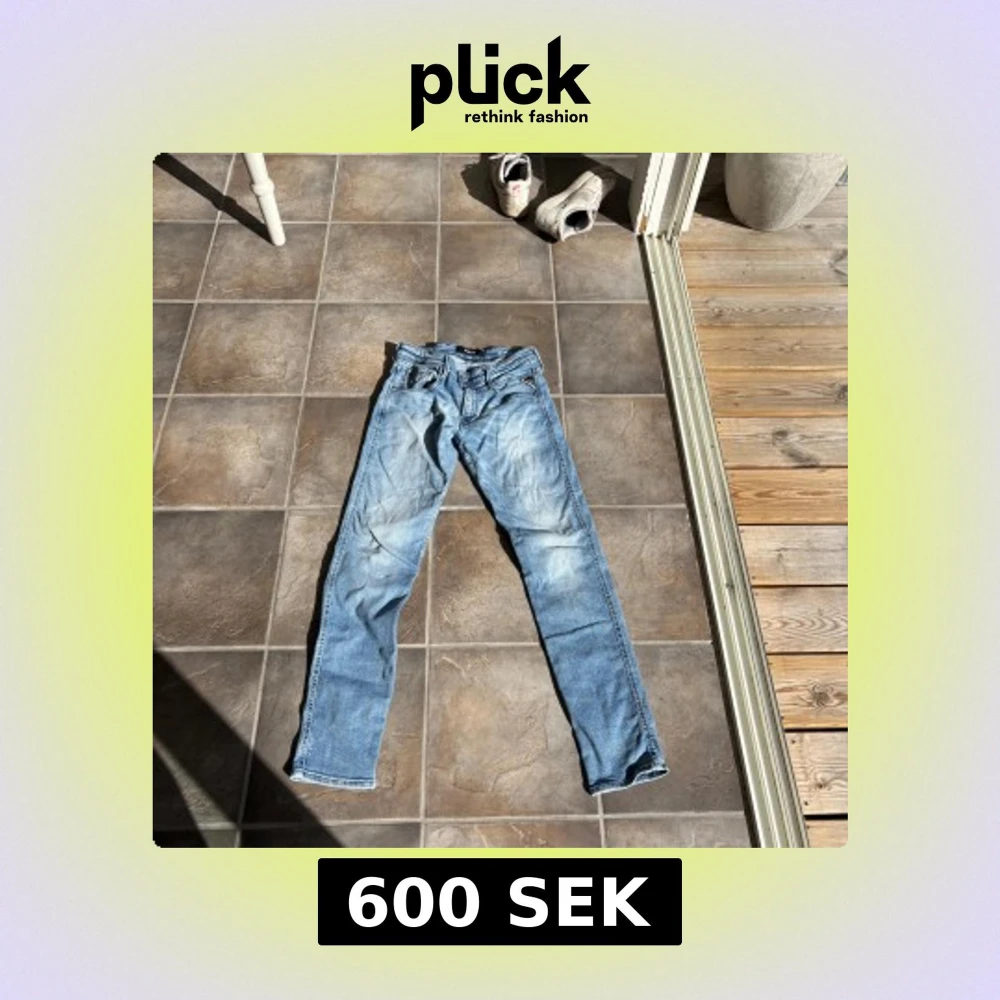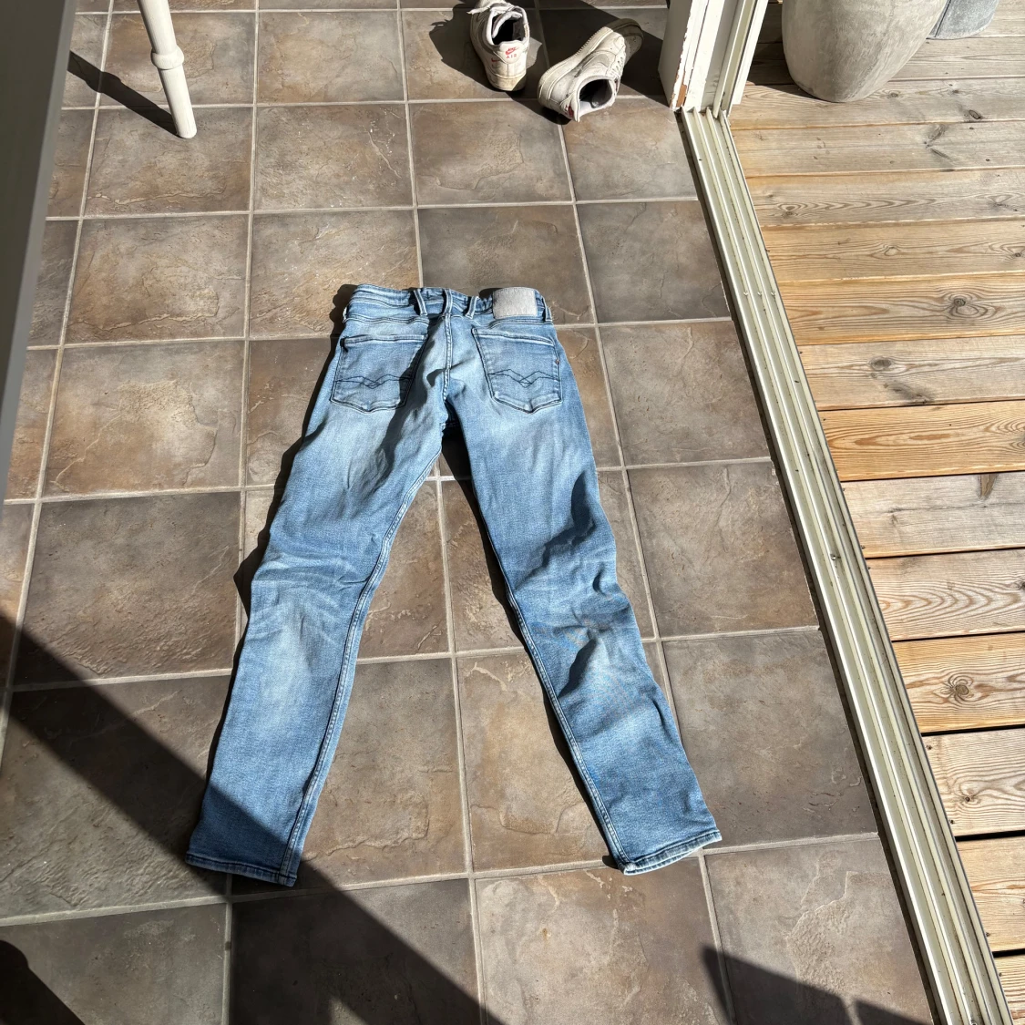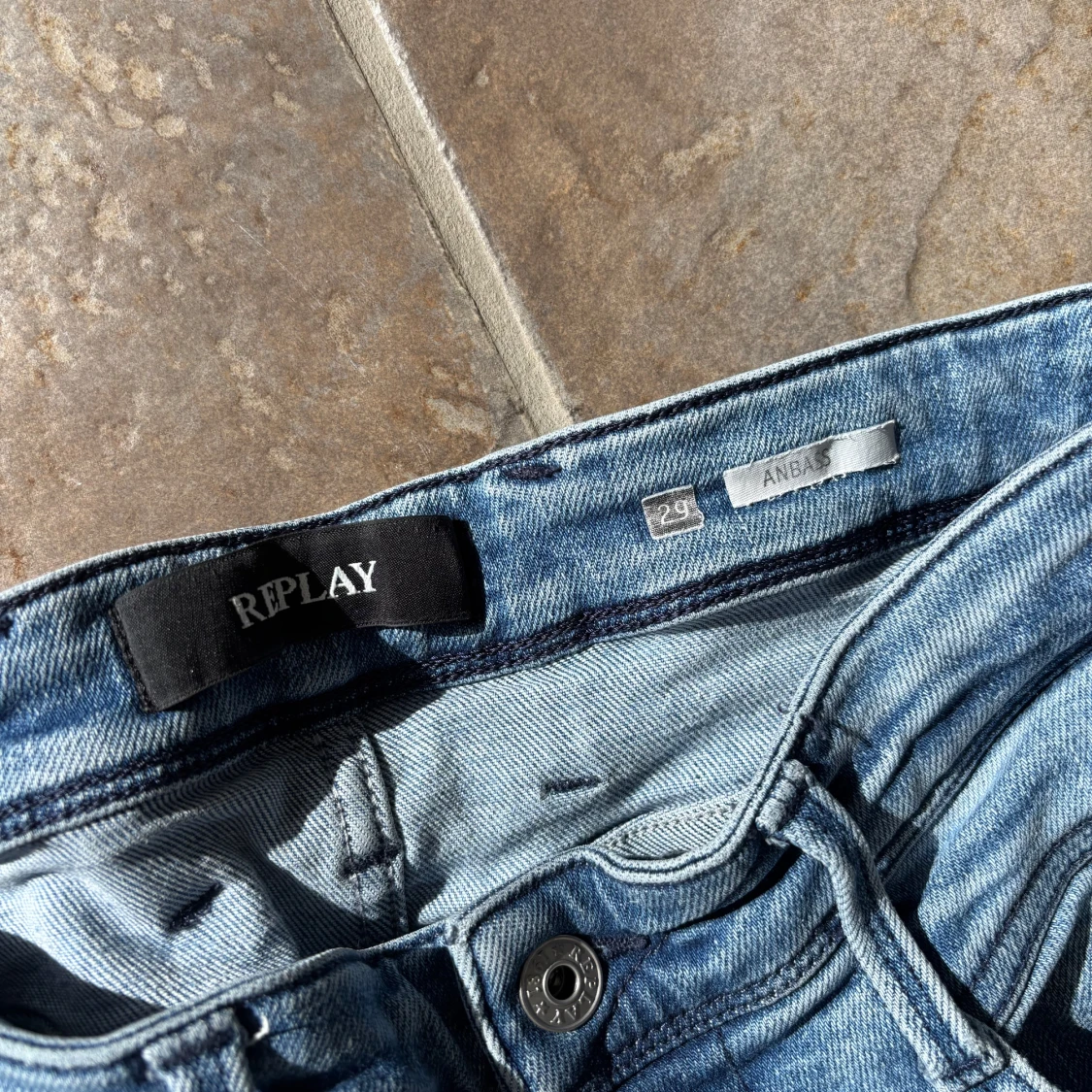 Säljer ett par Replay Anbass jeans i ljusblå tvätt med snygga slitningar och klassisk femficksdesign. Jeansen har smal passform och raka ben, perfekt för dig som gillar en modern och avslappnad stil. Materialet är mjukt jeans och midjan är normal.