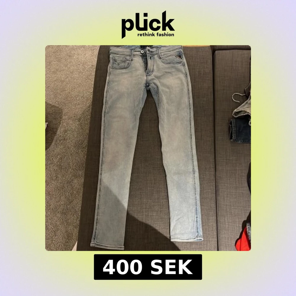 Säljer ett par Replay Anbass jeans i ljusblå tvätt med klassisk femficksdesign och snygga detaljer på bakfickorna. Jeansen har smal passform och är tillverkade i mjukt denimtyg som sitter riktigt bra. Perfekta för dig som gillar stilrena och moderna jeans längd 32.
