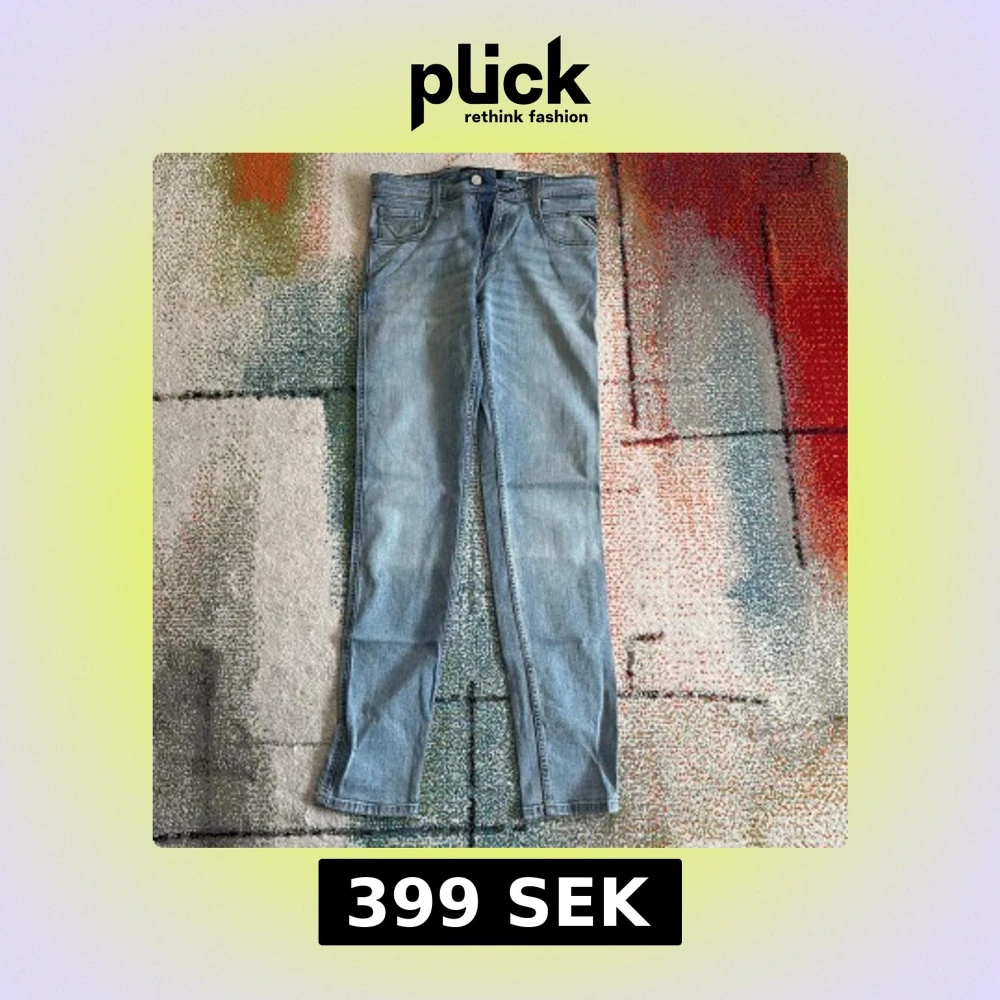 Säljer ett par ljusblå Replay Anbass jeans i slim fit. Klassisk femficksmodell med dragkedjegylf och snygga slitningar. Jeansen är tillverkade i mjuk denim och har en modern, smal passform som sitter snyggt längs benen.