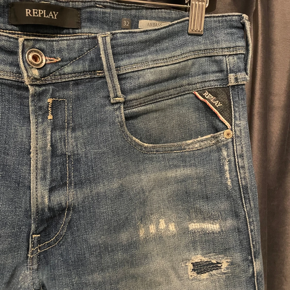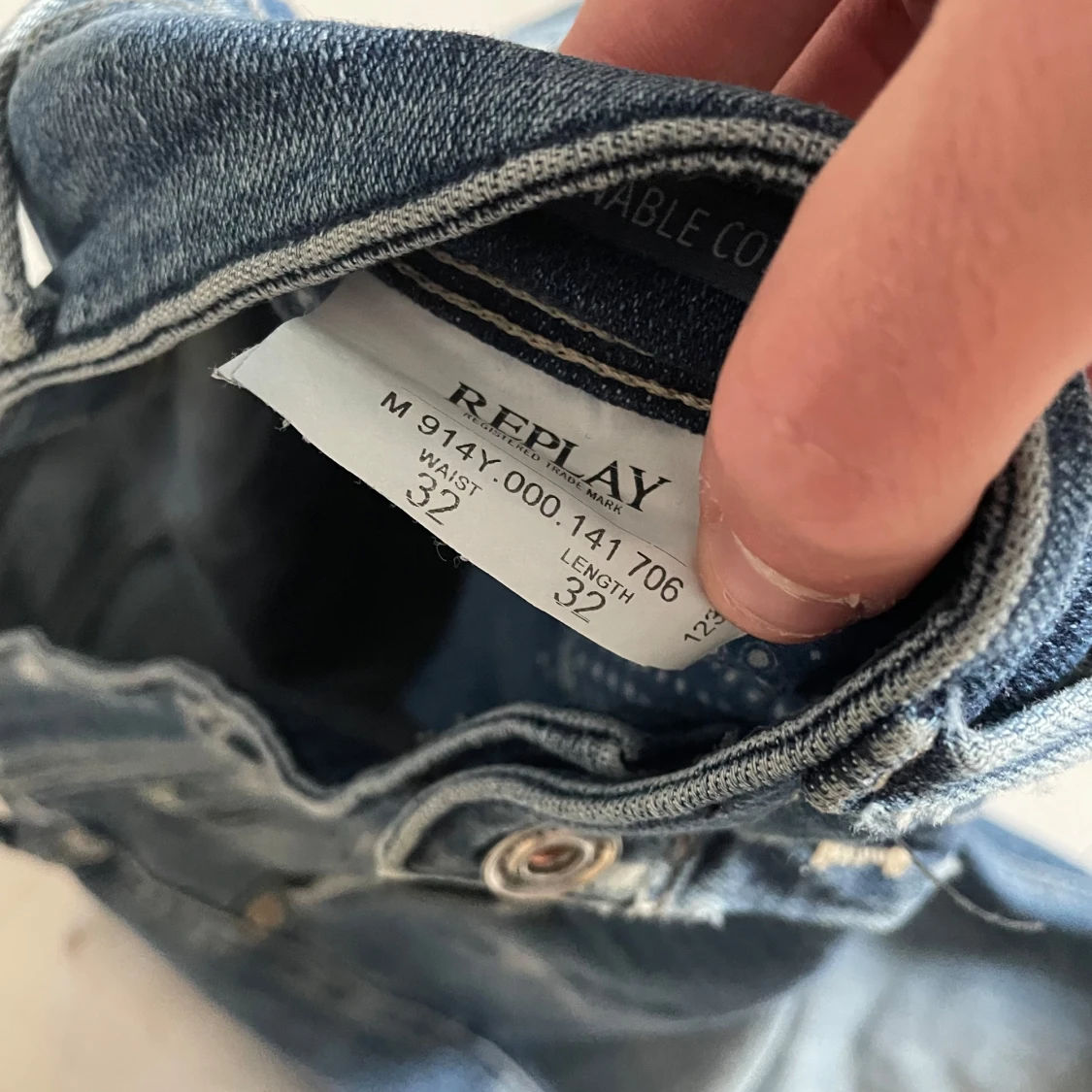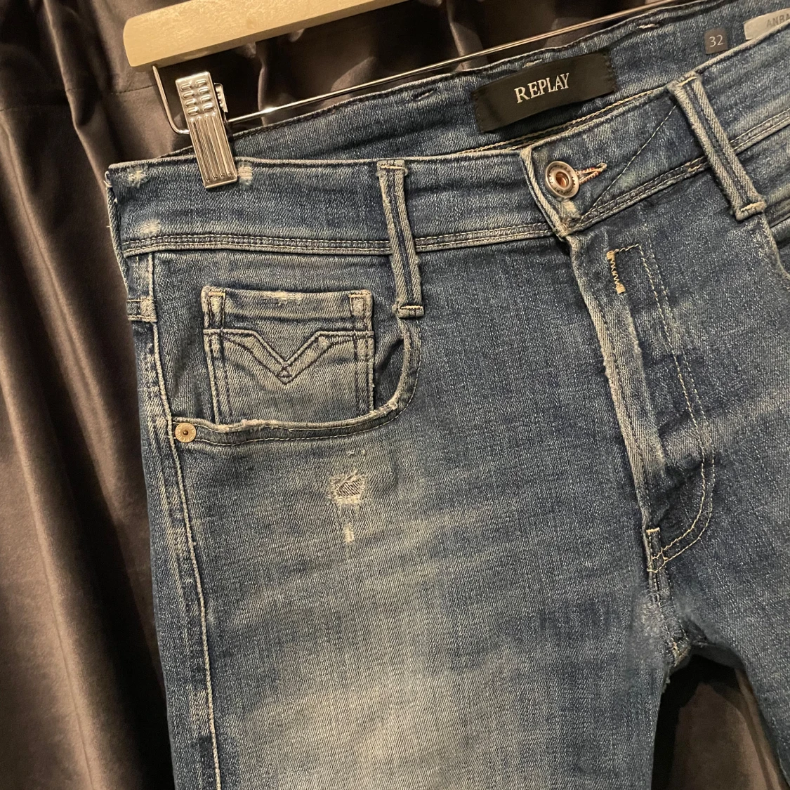 Replay anbass - skick 8/10, fint skick! - stl 32/32 - skriv om ni vill ha mått 📏- Inga defekter förutom en liten lagning på baksidan men som är inte är märkbar - fetaste jeansen på marknaden, snygga slitningar och snygg färg! - hör av er vid frågor!🙌