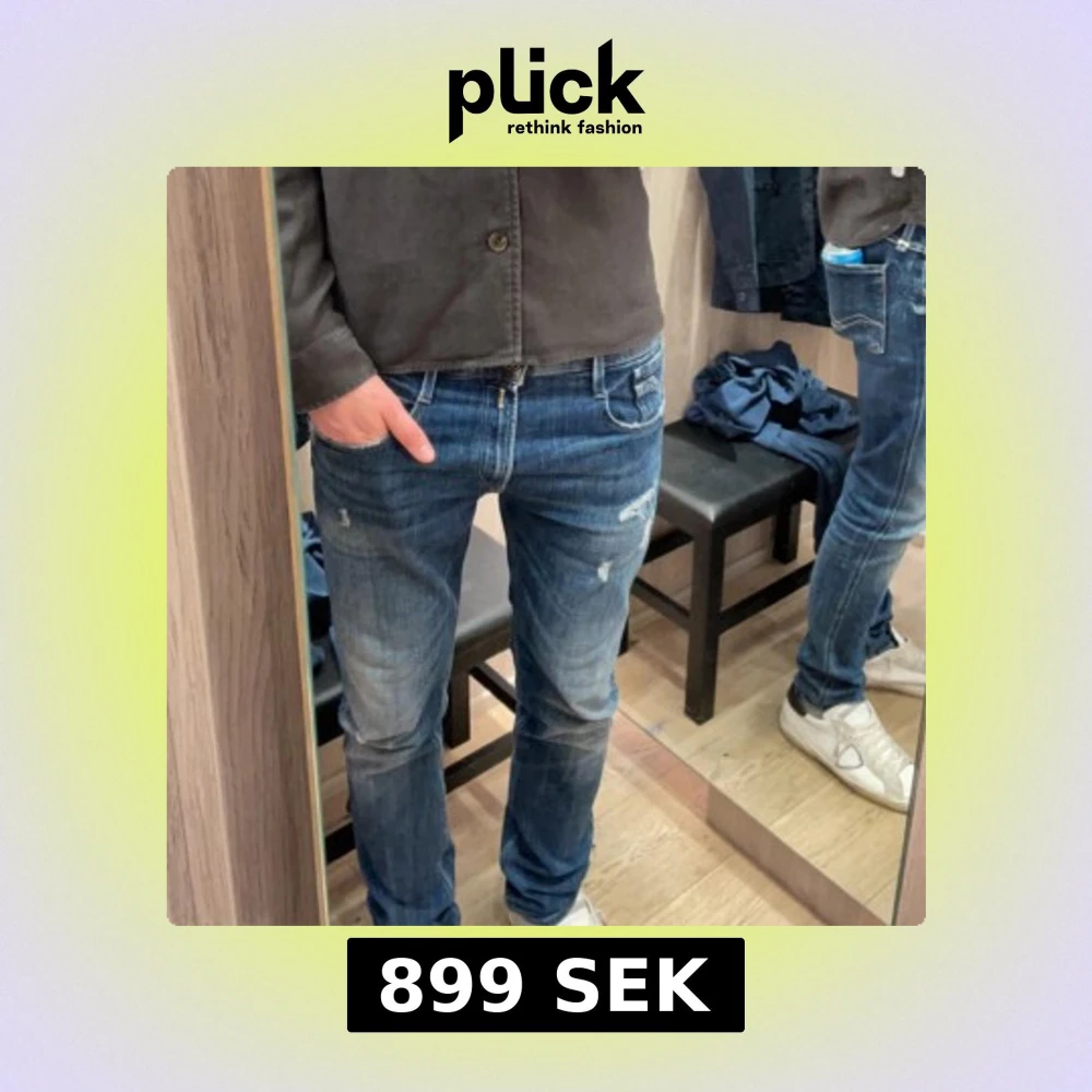 Säljer ett par blå Replay Anbass jeans i slim fit med snygga slitningar och klassisk femficksdesign. Jeansen har dragkedjegylf, läderpatch bak och tydliga Replay-detaljer. Perfekta för dig som gillar en smalare passform och cool tvätt.